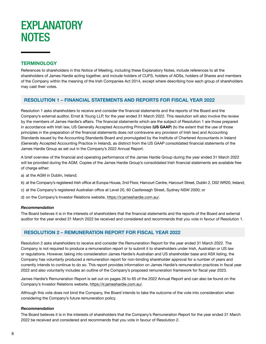 8 EXPLANATORY NOTES TERMINOLOGY References to shareholders in this Notice of Meeting, including these Explanatory Notes, include references to all the shareholders of James Hardie acting together, and include holders of CUFS, holders of ADSs, holders of Shares and members of the Company within the meaning of the Irish Companies Act 2014, except where describing how each group of shareholders may cast their votes. RESOLUTION 1 – FINANCIAL STATEMENTS AND REPORTS FOR FISCAL YEAR 2022 Resolution 1 asks shareholders to receive and consider the financial statements and the reports of the Board and the Company’s external auditor, Ernst & Young LLP, for the year ended 31 March 2022. This resolution will also involve the review by the members of James Hardie’s affairs. The financial statements which are the subject of Resolution 1 are those prepared in accordance with Irish law, US Generally Accepted Accounting Principles (US GAAP) (to the extent that the use of those principles in the preparation of the financial statements does not contravene any provision of Irish law) and Accounting Standards issued by the Accounting Standards Board and promulgated by the Institute of Chartered Accountants in Ireland (Generally Accepted Accounting Practice in Ireland), as distinct from the US GAAP consolidated financial statements of the James Hardie Group as set out in the Company’s 2022 Annual Report. A brief overview of the financial and operating performance of the James Hardie Group during the year ended 31 March 2022 will be provided during the AGM. Copies of the James Hardie Group’s consolidated Irish financial statements are available free of charge either: a) at the AGM in Dublin, Ireland; b) at the Company’s registered Irish office at Europa House, 2nd Floor, Harcourt Centre, Harcourt Street, Dublin 2, D02 WR20, Ireland; c) at the Company’s registered Australian office at Level 20, 60 Castlereagh Street, Sydney NSW 2000; or d) on the Company’s Investor Relations website, https://ir.jameshardie.com.au/. Recommendation The Board believes it is in the interests of shareholders that the financial statements and the reports of the Board and external auditor for the year ended 31 March 2022 be received and considered and recommends that you vote in favour of Resolution 1. RESOLUTION 2 – REMUNERATION REPORT FOR FISCAL YEAR 2022 Resolution 2 asks shareholders to receive and consider the Remuneration Report for the year ended 31 March 2022. The Company is not required to produce a remuneration report or to submit it to shareholders under Irish, Australian or US law or regulations. However, taking into consideration James Hardie’s Australian and US shareholder base and ASX listing, the Company has voluntarily produced a remuneration report for non-binding shareholder approval for a number of years and currently intends to continue to do so. This report provides information on James Hardie’s remuneration practices in fiscal year 2022 and also voluntarily includes an outline of the Company’s proposed remuneration framework for fiscal year 2023. James Hardie’s Remuneration Report is set out on pages 26 to 65 of the 2022 Annual Report and can also be found on the Company’s Investor Relations website, https://ir.jameshardie.com.au/. Although this vote does not bind the Company, the Board intends to take the outcome of the vote into consideration when considering the Company’s future remuneration policy. Recommendation The Board believes it is in the interests of shareholders that the Company’s Remuneration Report for the year ended 31 March 2022 be received and considered and recommends that you vote in favour of Resolution 2.