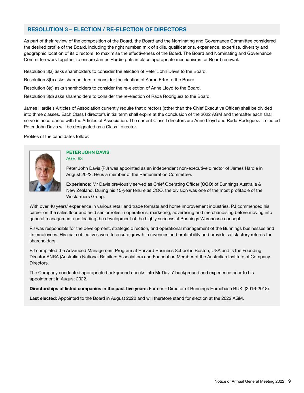 Notice of Annual General Meeting 2022 9 RESOLUTION 3 – ELECTION / RE-ELECTION OF DIRECTORS As part of their review of the composition of the Board, the Board and the Nominating and Governance Committee considered the desired profile of the Board, including the right number, mix of skills, qualifications, experience, expertise, diversity and geographic location of its directors, to maximise the effectiveness of the Board. The Board and Nominating and Governance Committee work together to ensure James Hardie puts in place appropriate mechanisms for Board renewal. Resolution 3(a) asks shareholders to consider the election of Peter John Davis to the Board. Resolution 3(b) asks shareholders to consider the election of Aaron Erter to the Board. Resolution 3(c) asks shareholders to consider the re-election of Anne Lloyd to the Board. Resolution 3(d) asks shareholders to consider the re-election of Rada Rodriguez to the Board. James Hardie’s Articles of Association currently require that directors (other than the Chief Executive Officer) shall be divided into three classes. Each Class I director’s initial term shall expire at the conclusion of the 2022 AGM and thereafter each shall serve in accordance with the Articles of Association. The current Class I directors are Anne Lloyd and Rada Rodriguez. If elected Peter John Davis will be designated as a Class I director. Profiles of the candidates follow: PETER JOHN DAVIS AGE: 63 Peter John Davis (PJ) was appointed as an independent non-executive director of James Hardie in August 2022. He is a member of the Remuneration Committee. Experience: Mr Davis previously served as Chief Operating Officer (COO) of Bunnings Australia & New Zealand. During his 15-year tenure as COO, the division was one of the most profitable of the Wesfarmers Group. With over 40 years’ experience in various retail and trade formats and home improvement industries, PJ commenced his career on the sales floor and held senior roles in operations, marketing, advertising and merchandising before moving into general management and leading the development of the highly successful Bunnings Warehouse concept. PJ was responsible for the development, strategic direction, and operational management of the Bunnings businesses and its employees. His main objectives were to ensure growth in revenues and profitability and provide satisfactory returns for shareholders. PJ completed the Advanced Management Program at Harvard Business School in Boston, USA and is the Founding Director ANRA (Australian National Retailers Association) and Foundation Member of the Australian Institute of Company Directors. The Company conducted appropriate background checks into Mr Davis’ background and experience prior to his appointment in August 2022. Directorships of listed companies in the past five years: Former – Director of Bunnings Homebase BUKI (2016-2018). Last elected: Appointed to the Board in August 2022 and will therefore stand for election at the 2022 AGM.