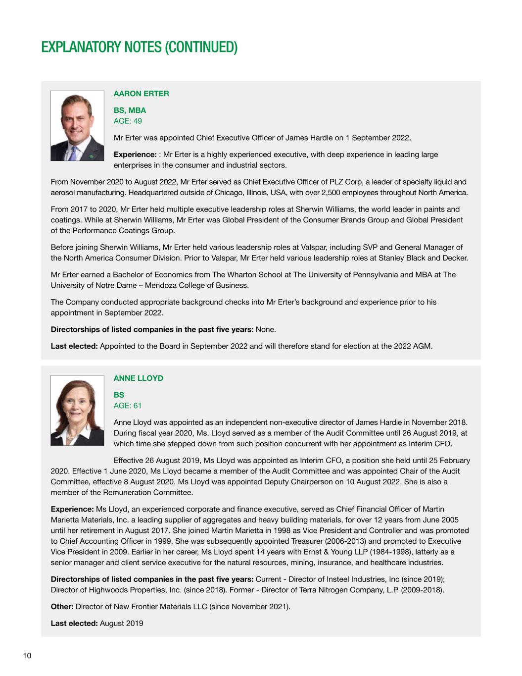 10 AARON ERTER BS, MBA AGE: 49 Mr Erter was appointed Chief Executive Officer of James Hardie on 1 September 2022. Experience: : Mr Erter is a highly experienced executive, with deep experience in leading large enterprises in the consumer and industrial sectors. From November 2020 to August 2022, Mr Erter served as Chief Executive Officer of PLZ Corp, a leader of specialty liquid and aerosol manufacturing. Headquartered outside of Chicago, Illinois, USA, with over 2,500 employees throughout North America. From 2017 to 2020, Mr Erter held multiple executive leadership roles at Sherwin Williams, the world leader in paints and coatings. While at Sherwin Williams, Mr Erter was Global President of the Consumer Brands Group and Global President of the Performance Coatings Group. Before joining Sherwin Williams, Mr Erter held various leadership roles at Valspar, including SVP and General Manager of the North America Consumer Division. Prior to Valspar, Mr Erter held various leadership roles at Stanley Black and Decker. Mr Erter earned a Bachelor of Economics from The Wharton School at The University of Pennsylvania and MBA at The University of Notre Dame – Mendoza College of Business. The Company conducted appropriate background checks into Mr Erter’s background and experience prior to his appointment in September 2022. Directorships of listed companies in the past five years: None. Last elected: Appointed to the Board in September 2022 and will therefore stand for election at the 2022 AGM. ANNE LLOYD BS AGE: 61 Anne Lloyd was appointed as an independent non-executive director of James Hardie in November 2018. During fiscal year 2020, Ms. Lloyd served as a member of the Audit Committee until 26 August 2019, at which time she stepped down from such position concurrent with her appointment as Interim CFO. Effective 26 August 2019, Ms Lloyd was appointed as Interim CFO, a position she held until 25 February 2020. Effective 1 June 2020, Ms Lloyd became a member of the Audit Committee and was appointed Chair of the Audit Committee, effective 8 August 2020. Ms Lloyd was appointed Deputy Chairperson on 10 August 2022. She is also a member of the Remuneration Committee. Experience: Ms Lloyd, an experienced corporate and finance executive, served as Chief Financial Officer of Martin Marietta Materials, Inc. a leading supplier of aggregates and heavy building materials, for over 12 years from June 2005 until her retirement in August 2017. She joined Martin Marietta in 1998 as Vice President and Controller and was promoted to Chief Accounting Officer in 1999. She was subsequently appointed Treasurer (2006-2013) and promoted to Executive Vice President in 2009. Earlier in her career, Ms Lloyd spent 14 years with Ernst & Young LLP (1984-1998), latterly as a senior manager and client service executive for the natural resources, mining, insurance, and healthcare industries. Directorships of listed companies in the past five years: Current - Director of Insteel Industries, Inc (since 2019); Director of Highwoods Properties, Inc. (since 2018). Former - Director of Terra Nitrogen Company, L.P. (2009-2018). Other: Director of New Frontier Materials LLC (since November 2021). Last elected: August 2019 EXPLANATORY NOTES (CONTINUED)