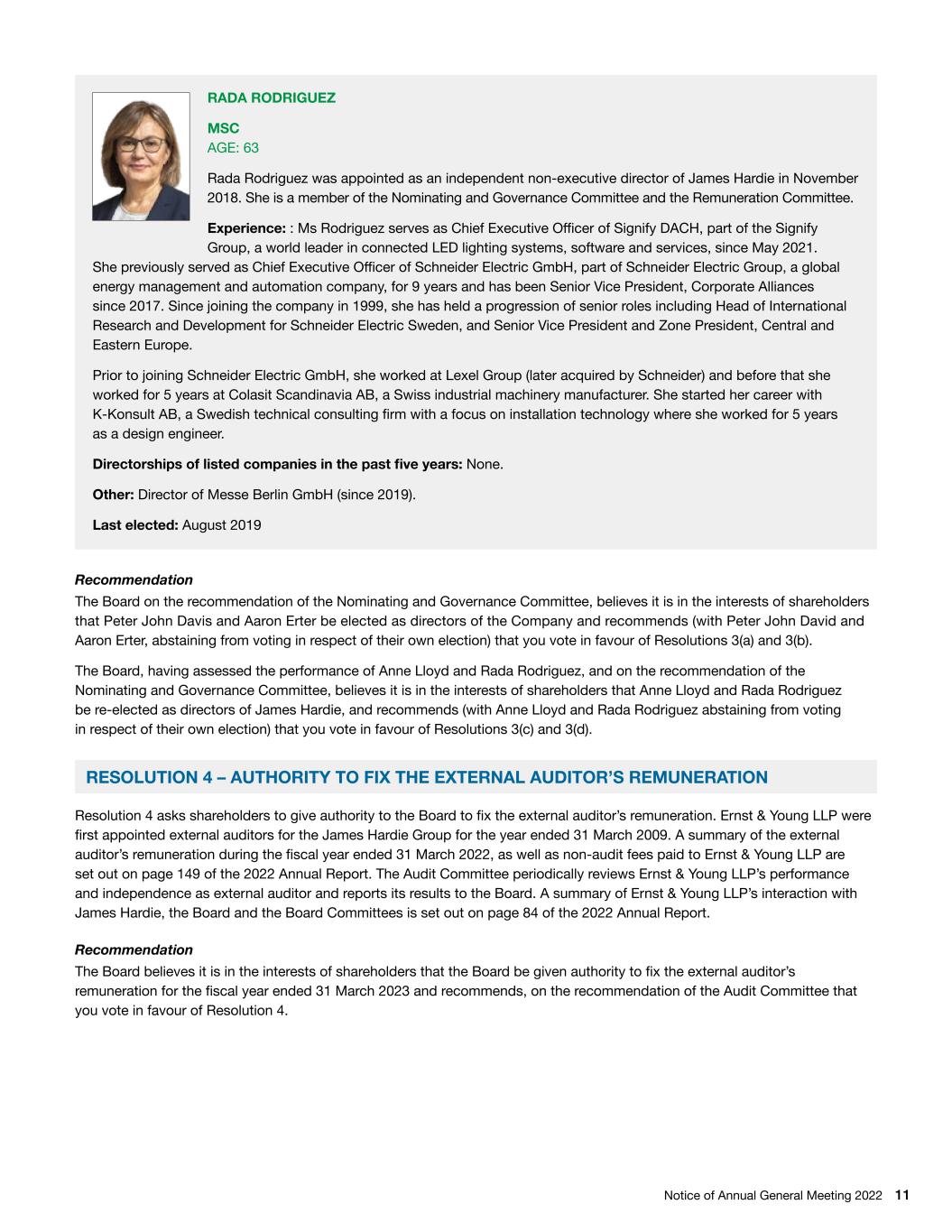 Notice of Annual General Meeting 2022 11 RADA RODRIGUEZ MSC AGE: 63 Rada Rodriguez was appointed as an independent non-executive director of James Hardie in November 2018. She is a member of the Nominating and Governance Committee and the Remuneration Committee. Experience: : Ms Rodriguez serves as Chief Executive Officer of Signify DACH, part of the Signify Group, a world leader in connected LED lighting systems, software and services, since May 2021. She previously served as Chief Executive Officer of Schneider Electric GmbH, part of Schneider Electric Group, a global energy management and automation company, for 9 years and has been Senior Vice President, Corporate Alliances since 2017. Since joining the company in 1999, she has held a progression of senior roles including Head of International Research and Development for Schneider Electric Sweden, and Senior Vice President and Zone President, Central and Eastern Europe. Prior to joining Schneider Electric GmbH, she worked at Lexel Group (later acquired by Schneider) and before that she worked for 5 years at Colasit Scandinavia AB, a Swiss industrial machinery manufacturer. She started her career with K-Konsult AB, a Swedish technical consulting firm with a focus on installation technology where she worked for 5 years as a design engineer. Directorships of listed companies in the past five years: None. Other: Director of Messe Berlin GmbH (since 2019). Last elected: August 2019 Recommendation The Board on the recommendation of the Nominating and Governance Committee, believes it is in the interests of shareholders that Peter John Davis and Aaron Erter be elected as directors of the Company and recommends (with Peter John David and Aaron Erter, abstaining from voting in respect of their own election) that you vote in favour of Resolutions 3(a) and 3(b). The Board, having assessed the performance of Anne Lloyd and Rada Rodriguez, and on the recommendation of the Nominating and Governance Committee, believes it is in the interests of shareholders that Anne Lloyd and Rada Rodriguez be re-elected as directors of James Hardie, and recommends (with Anne Lloyd and Rada Rodriguez abstaining from voting in respect of their own election) that you vote in favour of Resolutions 3(c) and 3(d). RESOLUTION 4 – AUTHORITY TO FIX THE EXTERNAL AUDITOR’S REMUNERATION Resolution 4 asks shareholders to give authority to the Board to fix the external auditor’s remuneration. Ernst & Young LLP were first appointed external auditors for the James Hardie Group for the year ended 31 March 2009. A summary of the external auditor’s remuneration during the fiscal year ended 31 March 2022, as well as non-audit fees paid to Ernst & Young LLP are set out on page 149 of the 2022 Annual Report. The Audit Committee periodically reviews Ernst & Young LLP’s performance and independence as external auditor and reports its results to the Board. A summary of Ernst & Young LLP’s interaction with James Hardie, the Board and the Board Committees is set out on page 84 of the 2022 Annual Report. Recommendation The Board believes it is in the interests of shareholders that the Board be given authority to fix the external auditor’s remuneration for the fiscal year ended 31 March 2023 and recommends, on the recommendation of the Audit Committee that you vote in favour of Resolution 4.