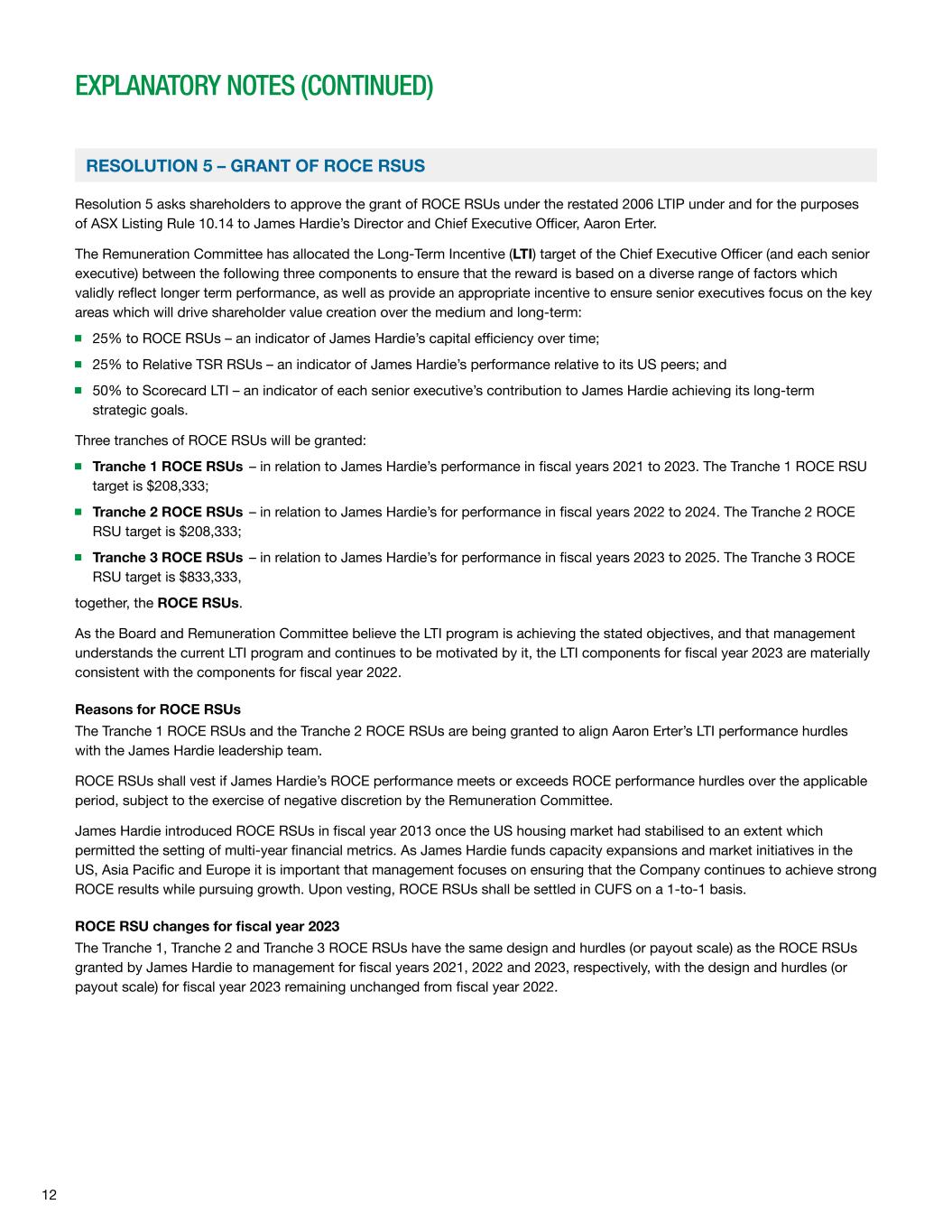 12 EXPLANATORY NOTES (CONTINUED) RESOLUTION 5 – GRANT OF ROCE RSUS Resolution 5 asks shareholders to approve the grant of ROCE RSUs under the restated 2006 LTIP under and for the purposes of ASX Listing Rule 10.14 to James Hardie’s Director and Chief Executive Officer, Aaron Erter. The Remuneration Committee has allocated the Long-Term Incentive (LTI) target of the Chief Executive Officer (and each senior executive) between the following three components to ensure that the reward is based on a diverse range of factors which validly reflect longer term performance, as well as provide an appropriate incentive to ensure senior executives focus on the key areas which will drive shareholder value creation over the medium and long-term: 25% to ROCE RSUs – an indicator of James Hardie’s capital efficiency over time; 25% to Relative TSR RSUs – an indicator of James Hardie’s performance relative to its US peers; and 50% to Scorecard LTI – an indicator of each senior executive’s contribution to James Hardie achieving its long-term strategic goals. Three tranches of ROCE RSUs will be granted: Tranche 1 ROCE RSUs – in relation to James Hardie’s performance in fiscal years 2021 to 2023. The Tranche 1 ROCE RSU target is $208,333; Tranche 2 ROCE RSUs – in relation to James Hardie’s for performance in fiscal years 2022 to 2024. The Tranche 2 ROCE RSU target is $208,333; Tranche 3 ROCE RSUs – in relation to James Hardie’s for performance in fiscal years 2023 to 2025. The Tranche 3 ROCE RSU target is $833,333, together, the ROCE RSUs. As the Board and Remuneration Committee believe the LTI program is achieving the stated objectives, and that management understands the current LTI program and continues to be motivated by it, the LTI components for fiscal year 2023 are materially consistent with the components for fiscal year 2022. Reasons for ROCE RSUs The Tranche 1 ROCE RSUs and the Tranche 2 ROCE RSUs are being granted to align Aaron Erter’s LTI performance hurdles with the James Hardie leadership team. ROCE RSUs shall vest if James Hardie’s ROCE performance meets or exceeds ROCE performance hurdles over the applicable period, subject to the exercise of negative discretion by the Remuneration Committee. James Hardie introduced ROCE RSUs in fiscal year 2013 once the US housing market had stabilised to an extent which permitted the setting of multi-year financial metrics. As James Hardie funds capacity expansions and market initiatives in the US, Asia Pacific and Europe it is important that management focuses on ensuring that the Company continues to achieve strong ROCE results while pursuing growth. Upon vesting, ROCE RSUs shall be settled in CUFS on a 1-to-1 basis. ROCE RSU changes for fiscal year 2023 The Tranche 1, Tranche 2 and Tranche 3 ROCE RSUs have the same design and hurdles (or payout scale) as the ROCE RSUs granted by James Hardie to management for fiscal years 2021, 2022 and 2023, respectively, with the design and hurdles (or payout scale) for fiscal year 2023 remaining unchanged from fiscal year 2022.