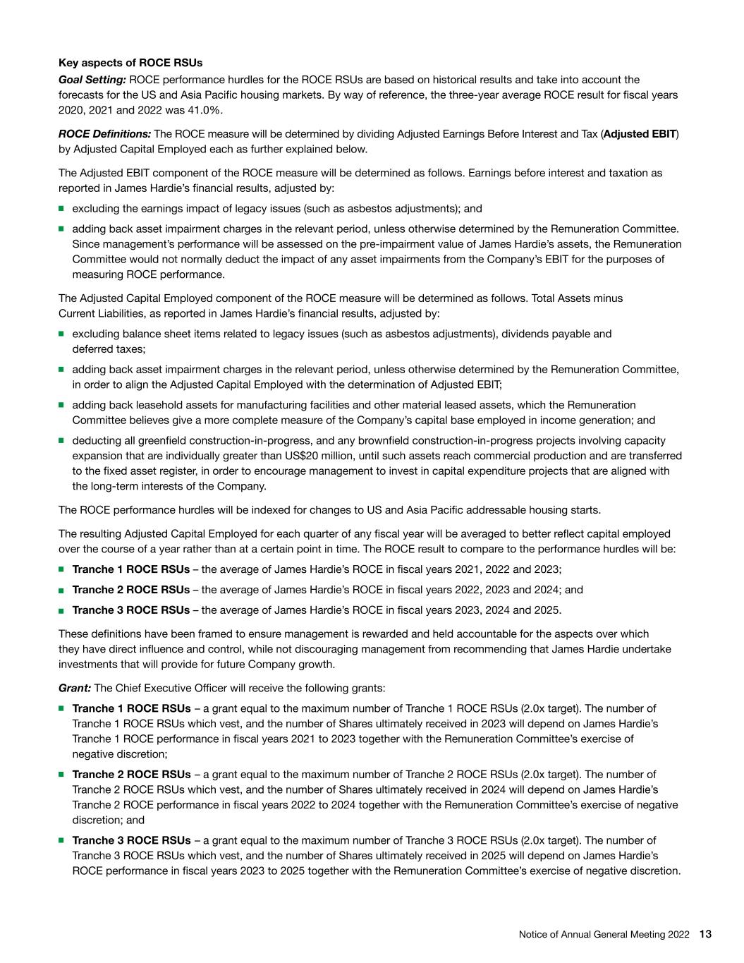 Notice of Annual General Meeting 2022 13 Key aspects of ROCE RSUs Goal Setting: ROCE performance hurdles for the ROCE RSUs are based on historical results and take into account the forecasts for the US and Asia Pacific housing markets. By way of reference, the three-year average ROCE result for fiscal years 2020, 2021 and 2022 was 41.0%. ROCE Definitions: The ROCE measure will be determined by dividing Adjusted Earnings Before Interest and Tax (Adjusted EBIT) by Adjusted Capital Employed each as further explained below. The Adjusted EBIT component of the ROCE measure will be determined as follows. Earnings before interest and taxation as reported in James Hardie’s financial results, adjusted by: excluding the earnings impact of legacy issues (such as asbestos adjustments); and adding back asset impairment charges in the relevant period, unless otherwise determined by the Remuneration Committee. Since management’s performance will be assessed on the pre-impairment value of James Hardie’s assets, the Remuneration Committee would not normally deduct the impact of any asset impairments from the Company’s EBIT for the purposes of measuring ROCE performance. The Adjusted Capital Employed component of the ROCE measure will be determined as follows. Total Assets minus Current Liabilities, as reported in James Hardie’s financial results, adjusted by: excluding balance sheet items related to legacy issues (such as asbestos adjustments), dividends payable and deferred taxes; adding back asset impairment charges in the relevant period, unless otherwise determined by the Remuneration Committee, in order to align the Adjusted Capital Employed with the determination of Adjusted EBIT; adding back leasehold assets for manufacturing facilities and other material leased assets, which the Remuneration Committee believes give a more complete measure of the Company’s capital base employed in income generation; and deducting all greenfield construction-in-progress, and any brownfield construction-in-progress projects involving capacity expansion that are individually greater than US$20 million, until such assets reach commercial production and are transferred to the fixed asset register, in order to encourage management to invest in capital expenditure projects that are aligned with the long-term interests of the Company. The ROCE performance hurdles will be indexed for changes to US and Asia Pacific addressable housing starts. The resulting Adjusted Capital Employed for each quarter of any fiscal year will be averaged to better reflect capital employed over the course of a year rather than at a certain point in time. The ROCE result to compare to the performance hurdles will be: Tranche 1 ROCE RSUs – the average of James Hardie’s ROCE in fiscal years 2021, 2022 and 2023; Tranche 2 ROCE RSUs – the average of James Hardie’s ROCE in fiscal years 2022, 2023 and 2024; and Tranche 3 ROCE RSUs – the average of James Hardie’s ROCE in fiscal years 2023, 2024 and 2025. These definitions have been framed to ensure management is rewarded and held accountable for the aspects over which they have direct influence and control, while not discouraging management from recommending that James Hardie undertake investments that will provide for future Company growth. Grant: The Chief Executive Officer will receive the following grants: Tranche 1 ROCE RSUs – a grant equal to the maximum number of Tranche 1 ROCE RSUs (2.0x target). The number of Tranche 1 ROCE RSUs which vest, and the number of Shares ultimately received in 2023 will depend on James Hardie’s Tranche 1 ROCE performance in fiscal years 2021 to 2023 together with the Remuneration Committee’s exercise of negative discretion; Tranche 2 ROCE RSUs – a grant equal to the maximum number of Tranche 2 ROCE RSUs (2.0x target). The number of Tranche 2 ROCE RSUs which vest, and the number of Shares ultimately received in 2024 will depend on James Hardie’s Tranche 2 ROCE performance in fiscal years 2022 to 2024 together with the Remuneration Committee’s exercise of negative discretion; and Tranche 3 ROCE RSUs – a grant equal to the maximum number of Tranche 3 ROCE RSUs (2.0x target). The number of Tranche 3 ROCE RSUs which vest, and the number of Shares ultimately received in 2025 will depend on James Hardie’s ROCE performance in fiscal years 2023 to 2025 together with the Remuneration Committee’s exercise of negative discretion.