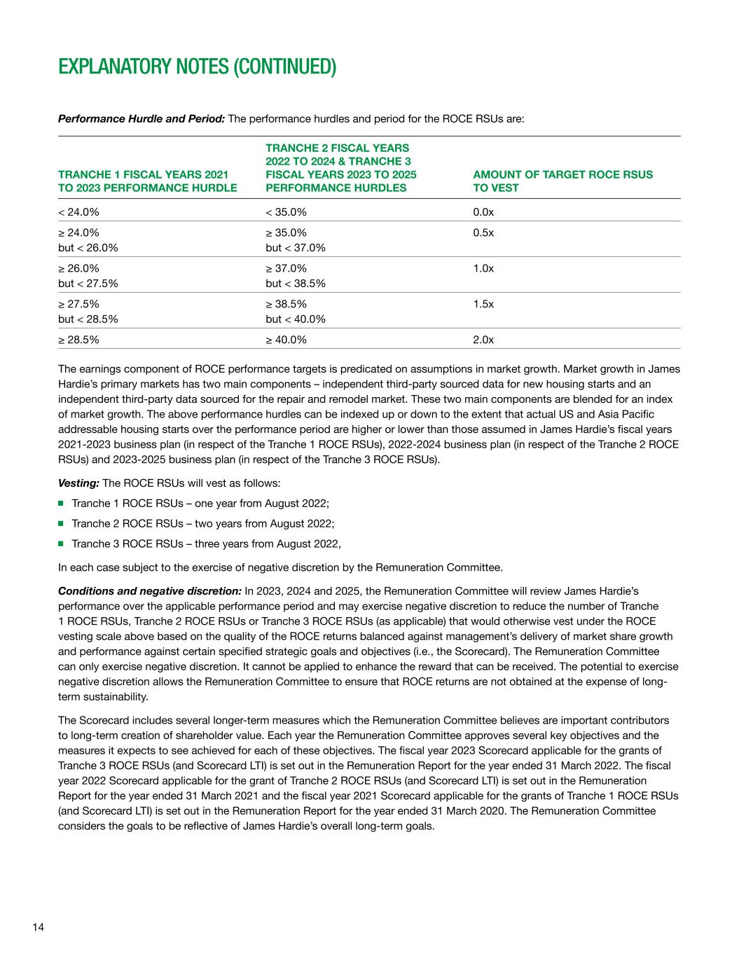14 EXPLANATORY NOTES (CONTINUED) Performance Hurdle and Period: The performance hurdles and period for the ROCE RSUs are: TRANCHE 1 FISCAL YEARS 2021 TO 2023 PERFORMANCE HURDLE TRANCHE 2 FISCAL YEARS 2022 TO 2024 & TRANCHE 3 FISCAL YEARS 2023 TO 2025 PERFORMANCE HURDLES AMOUNT OF TARGET ROCE RSUS TO VEST < 24.0% < 35.0% 0.0x ≥ 24.0% but < 26.0% ≥ 35.0% but < 37.0% 0.5x ≥ 26.0% but < 27.5% ≥ 37.0% but < 38.5% 1.0x ≥ 27.5% but < 28.5% ≥ 38.5% but < 40.0% 1.5x ≥ 28.5% ≥ 40.0% 2.0x The earnings component of ROCE performance targets is predicated on assumptions in market growth. Market growth in James Hardie’s primary markets has two main components – independent third-party sourced data for new housing starts and an independent third-party data sourced for the repair and remodel market. These two main components are blended for an index of market growth. The above performance hurdles can be indexed up or down to the extent that actual US and Asia Pacific addressable housing starts over the performance period are higher or lower than those assumed in James Hardie’s fiscal years 2021-2023 business plan (in respect of the Tranche 1 ROCE RSUs), 2022-2024 business plan (in respect of the Tranche 2 ROCE RSUs) and 2023-2025 business plan (in respect of the Tranche 3 ROCE RSUs). Vesting: The ROCE RSUs will vest as follows: Tranche 1 ROCE RSUs – one year from August 2022; Tranche 2 ROCE RSUs – two years from August 2022; Tranche 3 ROCE RSUs – three years from August 2022, In each case subject to the exercise of negative discretion by the Remuneration Committee. Conditions and negative discretion: In 2023, 2024 and 2025, the Remuneration Committee will review James Hardie’s performance over the applicable performance period and may exercise negative discretion to reduce the number of Tranche 1 ROCE RSUs, Tranche 2 ROCE RSUs or Tranche 3 ROCE RSUs (as applicable) that would otherwise vest under the ROCE vesting scale above based on the quality of the ROCE returns balanced against management’s delivery of market share growth and performance against certain specified strategic goals and objectives (i.e., the Scorecard). The Remuneration Committee can only exercise negative discretion. It cannot be applied to enhance the reward that can be received. The potential to exercise negative discretion allows the Remuneration Committee to ensure that ROCE returns are not obtained at the expense of long- term sustainability. The Scorecard includes several longer-term measures which the Remuneration Committee believes are important contributors to long-term creation of shareholder value. Each year the Remuneration Committee approves several key objectives and the measures it expects to see achieved for each of these objectives. The fiscal year 2023 Scorecard applicable for the grants of Tranche 3 ROCE RSUs (and Scorecard LTI) is set out in the Remuneration Report for the year ended 31 March 2022. The fiscal year 2022 Scorecard applicable for the grant of Tranche 2 ROCE RSUs (and Scorecard LTI) is set out in the Remuneration Report for the year ended 31 March 2021 and the fiscal year 2021 Scorecard applicable for the grants of Tranche 1 ROCE RSUs (and Scorecard LTI) is set out in the Remuneration Report for the year ended 31 March 2020. The Remuneration Committee considers the goals to be reflective of James Hardie’s overall long-term goals.