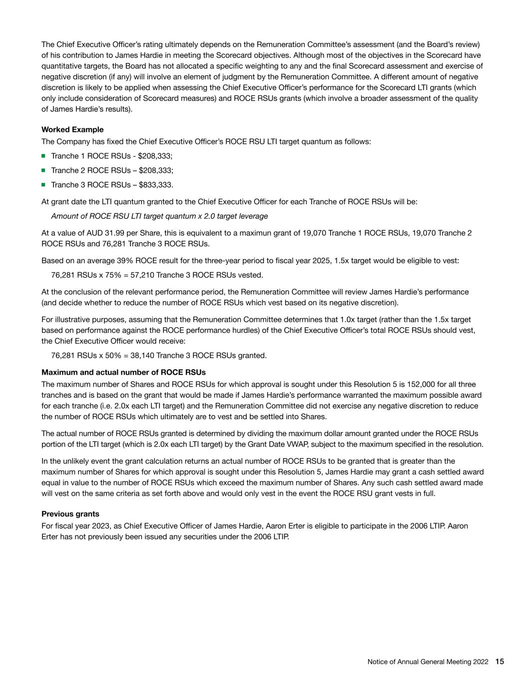Notice of Annual General Meeting 2022 15 The Chief Executive Officer’s rating ultimately depends on the Remuneration Committee’s assessment (and the Board’s review) of his contribution to James Hardie in meeting the Scorecard objectives. Although most of the objectives in the Scorecard have quantitative targets, the Board has not allocated a specific weighting to any and the final Scorecard assessment and exercise of negative discretion (if any) will involve an element of judgment by the Remuneration Committee. A different amount of negative discretion is likely to be applied when assessing the Chief Executive Officer’s performance for the Scorecard LTI grants (which only include consideration of Scorecard measures) and ROCE RSUs grants (which involve a broader assessment of the quality of James Hardie’s results). Worked Example The Company has fixed the Chief Executive Officer’s ROCE RSU LTI target quantum as follows: Tranche 1 ROCE RSUs - $208,333; Tranche 2 ROCE RSUs – $208,333; Tranche 3 ROCE RSUs – $833,333. At grant date the LTI quantum granted to the Chief Executive Officer for each Tranche of ROCE RSUs will be: Amount of ROCE RSU LTI target quantum x 2.0 target leverage At a value of AUD 31.99 per Share, this is equivalent to a maximun grant of 19,070 Tranche 1 ROCE RSUs, 19,070 Tranche 2 ROCE RSUs and 76,281 Tranche 3 ROCE RSUs. Based on an average 39% ROCE result for the three-year period to fiscal year 2025, 1.5x target would be eligible to vest: 76,281 RSUs x 75% = 57,210 Tranche 3 ROCE RSUs vested. At the conclusion of the relevant performance period, the Remuneration Committee will review James Hardie’s performance (and decide whether to reduce the number of ROCE RSUs which vest based on its negative discretion). For illustrative purposes, assuming that the Remuneration Committee determines that 1.0x target (rather than the 1.5x target based on performance against the ROCE performance hurdles) of the Chief Executive Officer’s total ROCE RSUs should vest, the Chief Executive Officer would receive: 76,281 RSUs x 50% = 38,140 Tranche 3 ROCE RSUs granted. Maximum and actual number of ROCE RSUs The maximum number of Shares and ROCE RSUs for which approval is sought under this Resolution 5 is 152,000 for all three tranches and is based on the grant that would be made if James Hardie’s performance warranted the maximum possible award for each tranche (i.e. 2.0x each LTI target) and the Remuneration Committee did not exercise any negative discretion to reduce the number of ROCE RSUs which ultimately are to vest and be settled into Shares. The actual number of ROCE RSUs granted is determined by dividing the maximum dollar amount granted under the ROCE RSUs portion of the LTI target (which is 2.0x each LTI target) by the Grant Date VWAP, subject to the maximum specified in the resolution. In the unlikely event the grant calculation returns an actual number of ROCE RSUs to be granted that is greater than the maximum number of Shares for which approval is sought under this Resolution 5, James Hardie may grant a cash settled award equal in value to the number of ROCE RSUs which exceed the maximum number of Shares. Any such cash settled award made will vest on the same criteria as set forth above and would only vest in the event the ROCE RSU grant vests in full. Previous grants For fiscal year 2023, as Chief Executive Officer of James Hardie, Aaron Erter is eligible to participate in the 2006 LTIP. Aaron Erter has not previously been issued any securities under the 2006 LTIP.
