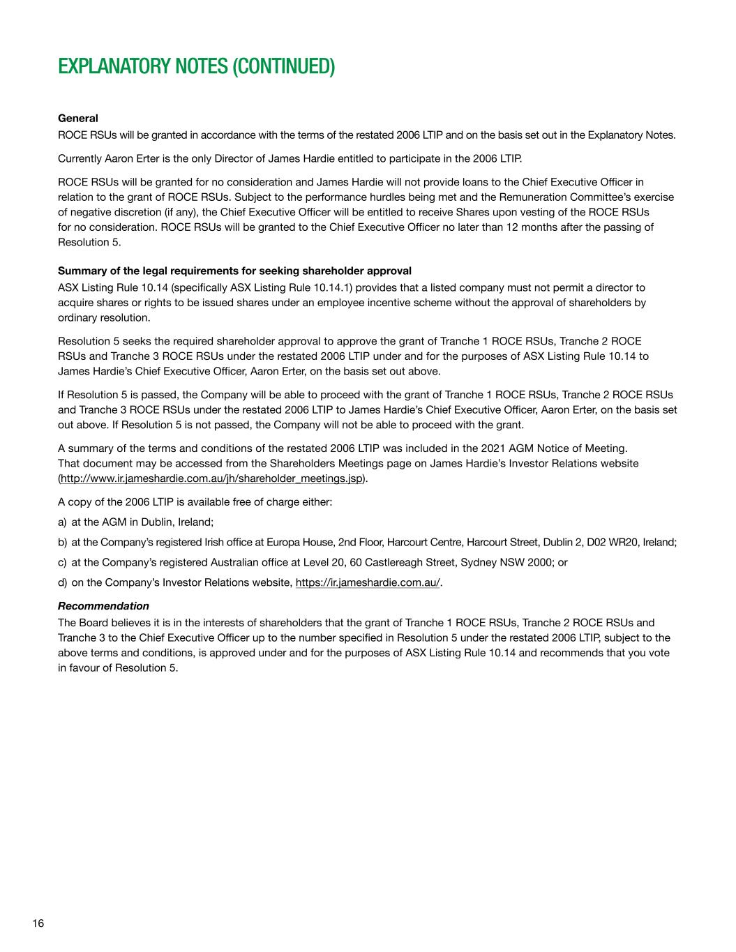16 EXPLANATORY NOTES (CONTINUED) General ROCE RSUs will be granted in accordance with the terms of the restated 2006 LTIP and on the basis set out in the Explanatory Notes. Currently Aaron Erter is the only Director of James Hardie entitled to participate in the 2006 LTIP. ROCE RSUs will be granted for no consideration and James Hardie will not provide loans to the Chief Executive Officer in relation to the grant of ROCE RSUs. Subject to the performance hurdles being met and the Remuneration Committee’s exercise of negative discretion (if any), the Chief Executive Officer will be entitled to receive Shares upon vesting of the ROCE RSUs for no consideration. ROCE RSUs will be granted to the Chief Executive Officer no later than 12 months after the passing of Resolution 5. Summary of the legal requirements for seeking shareholder approval ASX Listing Rule 10.14 (specifically ASX Listing Rule 10.14.1) provides that a listed company must not permit a director to acquire shares or rights to be issued shares under an employee incentive scheme without the approval of shareholders by ordinary resolution. Resolution 5 seeks the required shareholder approval to approve the grant of Tranche 1 ROCE RSUs, Tranche 2 ROCE RSUs and Tranche 3 ROCE RSUs under the restated 2006 LTIP under and for the purposes of ASX Listing Rule 10.14 to James Hardie’s Chief Executive Officer, Aaron Erter, on the basis set out above. If Resolution 5 is passed, the Company will be able to proceed with the grant of Tranche 1 ROCE RSUs, Tranche 2 ROCE RSUs and Tranche 3 ROCE RSUs under the restated 2006 LTIP to James Hardie’s Chief Executive Officer, Aaron Erter, on the basis set out above. If Resolution 5 is not passed, the Company will not be able to proceed with the grant. A summary of the terms and conditions of the restated 2006 LTIP was included in the 2021 AGM Notice of Meeting. That document may be accessed from the Shareholders Meetings page on James Hardie’s Investor Relations website (http://www.ir.jameshardie.com.au/jh/shareholder_meetings.jsp). A copy of the 2006 LTIP is available free of charge either: a) at the AGM in Dublin, Ireland; b) at the Company’s registered Irish office at Europa House, 2nd Floor, Harcourt Centre, Harcourt Street, Dublin 2, D02 WR20, Ireland; c) at the Company’s registered Australian office at Level 20, 60 Castlereagh Street, Sydney NSW 2000; or d) on the Company’s Investor Relations website, https://ir.jameshardie.com.au/. Recommendation The Board believes it is in the interests of shareholders that the grant of Tranche 1 ROCE RSUs, Tranche 2 ROCE RSUs and Tranche 3 to the Chief Executive Officer up to the number specified in Resolution 5 under the restated 2006 LTIP, subject to the above terms and conditions, is approved under and for the purposes of ASX Listing Rule 10.14 and recommends that you vote in favour of Resolution 5.