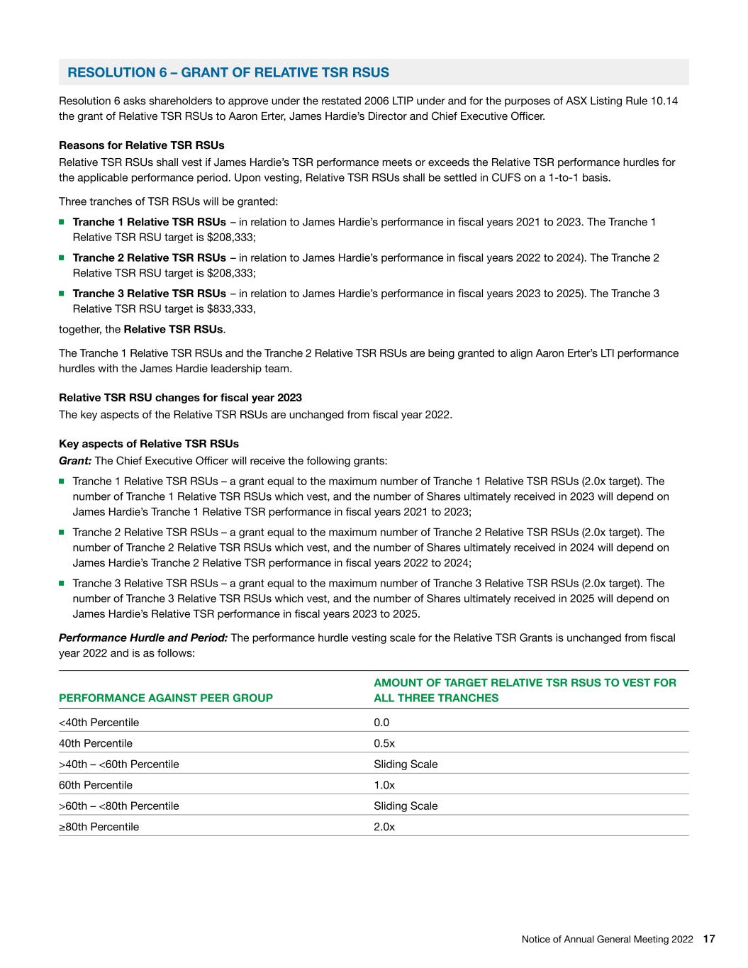 Notice of Annual General Meeting 2022 17 RESOLUTION 6 – GRANT OF RELATIVE TSR RSUS Resolution 6 asks shareholders to approve under the restated 2006 LTIP under and for the purposes of ASX Listing Rule 10.14 the grant of Relative TSR RSUs to Aaron Erter, James Hardie’s Director and Chief Executive Officer. Reasons for Relative TSR RSUs Relative TSR RSUs shall vest if James Hardie’s TSR performance meets or exceeds the Relative TSR performance hurdles for the applicable performance period. Upon vesting, Relative TSR RSUs shall be settled in CUFS on a 1-to-1 basis. Three tranches of TSR RSUs will be granted: Tranche 1 Relative TSR RSUs – in relation to James Hardie’s performance in fiscal years 2021 to 2023. The Tranche 1 Relative TSR RSU target is $208,333; Tranche 2 Relative TSR RSUs – in relation to James Hardie’s performance in fiscal years 2022 to 2024). The Tranche 2 Relative TSR RSU target is $208,333; Tranche 3 Relative TSR RSUs – in relation to James Hardie’s performance in fiscal years 2023 to 2025). The Tranche 3 Relative TSR RSU target is $833,333, together, the Relative TSR RSUs. The Tranche 1 Relative TSR RSUs and the Tranche 2 Relative TSR RSUs are being granted to align Aaron Erter’s LTI performance hurdles with the James Hardie leadership team. Relative TSR RSU changes for fiscal year 2023 The key aspects of the Relative TSR RSUs are unchanged from fiscal year 2022. Key aspects of Relative TSR RSUs Grant: The Chief Executive Officer will receive the following grants: Tranche 1 Relative TSR RSUs – a grant equal to the maximum number of Tranche 1 Relative TSR RSUs (2.0x target). The number of Tranche 1 Relative TSR RSUs which vest, and the number of Shares ultimately received in 2023 will depend on James Hardie’s Tranche 1 Relative TSR performance in fiscal years 2021 to 2023; Tranche 2 Relative TSR RSUs – a grant equal to the maximum number of Tranche 2 Relative TSR RSUs (2.0x target). The number of Tranche 2 Relative TSR RSUs which vest, and the number of Shares ultimately received in 2024 will depend on James Hardie’s Tranche 2 Relative TSR performance in fiscal years 2022 to 2024; Tranche 3 Relative TSR RSUs – a grant equal to the maximum number of Tranche 3 Relative TSR RSUs (2.0x target). The number of Tranche 3 Relative TSR RSUs which vest, and the number of Shares ultimately received in 2025 will depend on James Hardie’s Relative TSR performance in fiscal years 2023 to 2025. Performance Hurdle and Period: The performance hurdle vesting scale for the Relative TSR Grants is unchanged from fiscal year 2022 and is as follows: PERFORMANCE AGAINST PEER GROUP AMOUNT OF TARGET RELATIVE TSR RSUS TO VEST FOR ALL THREE TRANCHES <40th Percentile 0.0 40th Percentile 0.5x >40th – <60th Percentile Sliding Scale 60th Percentile 1.0x >60th – <80th Percentile Sliding Scale ≥80th Percentile 2.0x