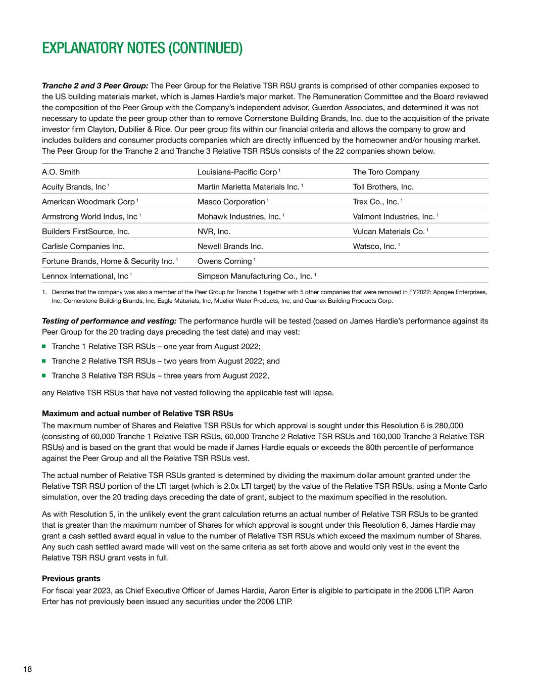 18 EXPLANATORY NOTES (CONTINUED) Tranche 2 and 3 Peer Group: The Peer Group for the Relative TSR RSU grants is comprised of other companies exposed to the US building materials market, which is James Hardie’s major market. The Remuneration Committee and the Board reviewed the composition of the Peer Group with the Company’s independent advisor, Guerdon Associates, and determined it was not necessary to update the peer group other than to remove Cornerstone Building Brands, Inc. due to the acquisition of the private investor firm Clayton, Dubilier & Rice. Our peer group fits within our financial criteria and allows the company to grow and includes builders and consumer products companies which are directly influenced by the homeowner and/or housing market. The Peer Group for the Tranche 2 and Tranche 3 Relative TSR RSUs consists of the 22 companies shown below. A.O. Smith Louisiana-Pacific Corp 1 The Toro Company Acuity Brands, Inc 1 Martin Marietta Materials Inc. 1 Toll Brothers, Inc. American Woodmark Corp 1 Masco Corporation 1 Trex Co., Inc. 1 Armstrong World Indus, Inc 1 Mohawk Industries, Inc. 1 Valmont Industries, Inc. 1 Builders FirstSource, Inc. NVR, Inc. Vulcan Materials Co. 1 Carlisle Companies Inc. Newell Brands Inc. Watsco, Inc. 1 Fortune Brands, Home & Security Inc. 1 Owens Corning 1 Lennox International, Inc 1 Simpson Manufacturing Co., Inc. 1 1. Denotes that the company was also a member of the Peer Group for Tranche 1 together with 5 other companies that were removed in FY2022: Apogee Enterprises, Inc, Cornerstone Building Brands, Inc, Eagle Materials, Inc, Mueller Water Products, Inc, and Quanex Building Products Corp. Testing of performance and vesting: The performance hurdle will be tested (based on James Hardie’s performance against its Peer Group for the 20 trading days preceding the test date) and may vest: Tranche 1 Relative TSR RSUs – one year from August 2022; Tranche 2 Relative TSR RSUs – two years from August 2022; and Tranche 3 Relative TSR RSUs – three years from August 2022, any Relative TSR RSUs that have not vested following the applicable test will lapse. Maximum and actual number of Relative TSR RSUs The maximum number of Shares and Relative TSR RSUs for which approval is sought under this Resolution 6 is 280,000 (consisting of 60,000 Tranche 1 Relative TSR RSUs, 60,000 Tranche 2 Relative TSR RSUs and 160,000 Tranche 3 Relative TSR RSUs) and is based on the grant that would be made if James Hardie equals or exceeds the 80th percentile of performance against the Peer Group and all the Relative TSR RSUs vest. The actual number of Relative TSR RSUs granted is determined by dividing the maximum dollar amount granted under the Relative TSR RSU portion of the LTI target (which is 2.0x LTI target) by the value of the Relative TSR RSUs, using a Monte Carlo simulation, over the 20 trading days preceding the date of grant, subject to the maximum specified in the resolution. As with Resolution 5, in the unlikely event the grant calculation returns an actual number of Relative TSR RSUs to be granted that is greater than the maximum number of Shares for which approval is sought under this Resolution 6, James Hardie may grant a cash settled award equal in value to the number of Relative TSR RSUs which exceed the maximum number of Shares. Any such cash settled award made will vest on the same criteria as set forth above and would only vest in the event the Relative TSR RSU grant vests in full. Previous grants For fiscal year 2023, as Chief Executive Officer of James Hardie, Aaron Erter is eligible to participate in the 2006 LTIP. Aaron Erter has not previously been issued any securities under the 2006 LTIP.