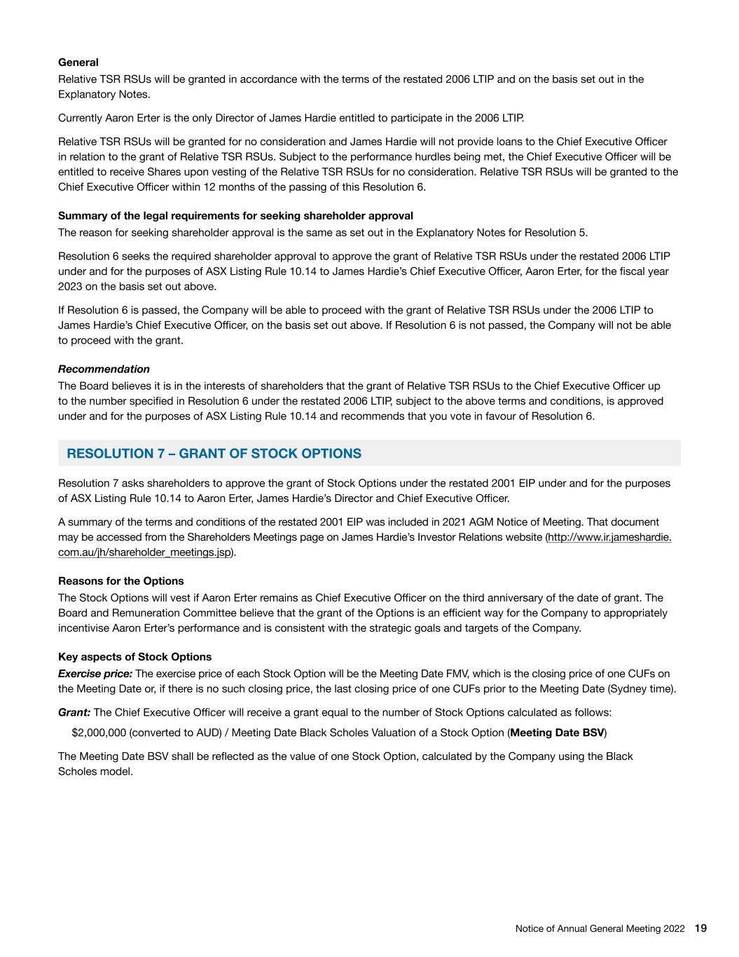 Notice of Annual General Meeting 2022 19 General Relative TSR RSUs will be granted in accordance with the terms of the restated 2006 LTIP and on the basis set out in the Explanatory Notes. Currently Aaron Erter is the only Director of James Hardie entitled to participate in the 2006 LTIP. Relative TSR RSUs will be granted for no consideration and James Hardie will not provide loans to the Chief Executive Officer in relation to the grant of Relative TSR RSUs. Subject to the performance hurdles being met, the Chief Executive Officer will be entitled to receive Shares upon vesting of the Relative TSR RSUs for no consideration. Relative TSR RSUs will be granted to the Chief Executive Officer within 12 months of the passing of this Resolution 6. Summary of the legal requirements for seeking shareholder approval The reason for seeking shareholder approval is the same as set out in the Explanatory Notes for Resolution 5. Resolution 6 seeks the required shareholder approval to approve the grant of Relative TSR RSUs under the restated 2006 LTIP under and for the purposes of ASX Listing Rule 10.14 to James Hardie’s Chief Executive Officer, Aaron Erter, for the fiscal year 2023 on the basis set out above. If Resolution 6 is passed, the Company will be able to proceed with the grant of Relative TSR RSUs under the 2006 LTIP to James Hardie’s Chief Executive Officer, on the basis set out above. If Resolution 6 is not passed, the Company will not be able to proceed with the grant. Recommendation The Board believes it is in the interests of shareholders that the grant of Relative TSR RSUs to the Chief Executive Officer up to the number specified in Resolution 6 under the restated 2006 LTIP, subject to the above terms and conditions, is approved under and for the purposes of ASX Listing Rule 10.14 and recommends that you vote in favour of Resolution 6. RESOLUTION 7 – GRANT OF STOCK OPTIONS Resolution 7 asks shareholders to approve the grant of Stock Options under the restated 2001 EIP under and for the purposes of ASX Listing Rule 10.14 to Aaron Erter, James Hardie’s Director and Chief Executive Officer. A summary of the terms and conditions of the restated 2001 EIP was included in 2021 AGM Notice of Meeting. That document may be accessed from the Shareholders Meetings page on James Hardie’s Investor Relations website (http://www.ir.jameshardie. com.au/jh/shareholder_meetings.jsp). Reasons for the Options The Stock Options will vest if Aaron Erter remains as Chief Executive Officer on the third anniversary of the date of grant. The Board and Remuneration Committee believe that the grant of the Options is an efficient way for the Company to appropriately incentivise Aaron Erter’s performance and is consistent with the strategic goals and targets of the Company. Key aspects of Stock Options Exercise price: The exercise price of each Stock Option will be the Meeting Date FMV, which is the closing price of one CUFs on the Meeting Date or, if there is no such closing price, the last closing price of one CUFs prior to the Meeting Date (Sydney time). Grant: The Chief Executive Officer will receive a grant equal to the number of Stock Options calculated as follows: $2,000,000 (converted to AUD) / Meeting Date Black Scholes Valuation of a Stock Option (Meeting Date BSV) The Meeting Date BSV shall be reflected as the value of one Stock Option, calculated by the Company using the Black Scholes model.