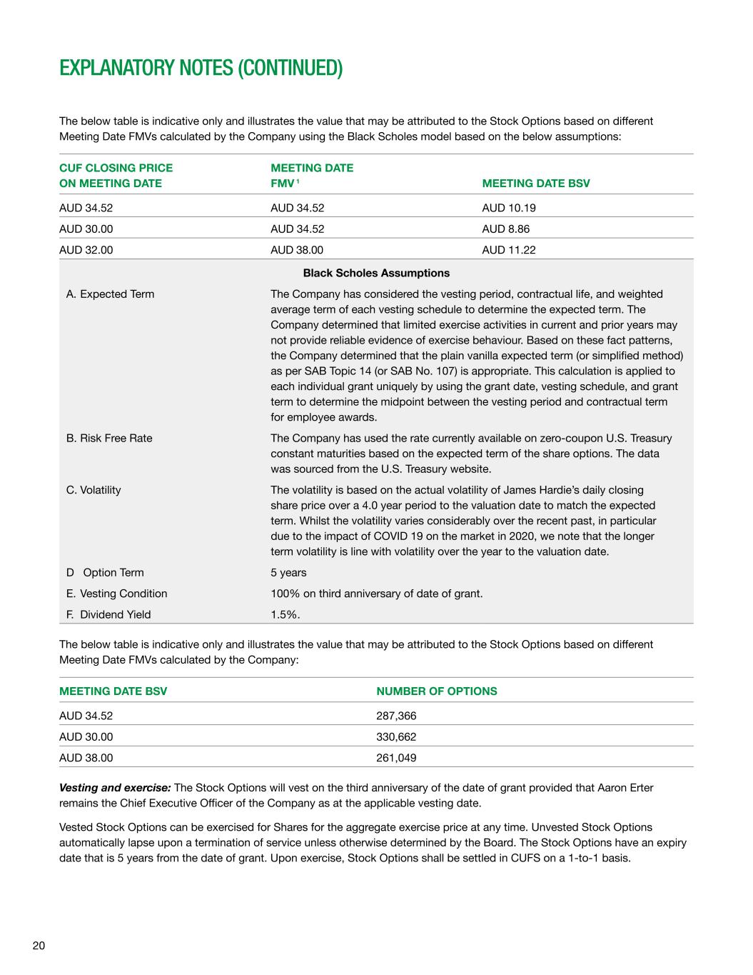 20 EXPLANATORY NOTES (CONTINUED) The below table is indicative only and illustrates the value that may be attributed to the Stock Options based on different Meeting Date FMVs calculated by the Company using the Black Scholes model based on the below assumptions: CUF CLOSING PRICE ON MEETING DATE MEETING DATE FMV 1 MEETING DATE BSV AUD 34.52 AUD 34.52 AUD 10.19 AUD 30.00 AUD 34.52 AUD 8.86 AUD 32.00 AUD 38.00 AUD 11.22 Black Scholes Assumptions A. Expected Term The Company has considered the vesting period, contractual life, and weighted average term of each vesting schedule to determine the expected term. The Company determined that limited exercise activities in current and prior years may not provide reliable evidence of exercise behaviour. Based on these fact patterns, the Company determined that the plain vanilla expected term (or simplified method) as per SAB Topic 14 (or SAB No. 107) is appropriate. This calculation is applied to each individual grant uniquely by using the grant date, vesting schedule, and grant term to determine the midpoint between the vesting period and contractual term for employee awards. B. Risk Free Rate The Company has used the rate currently available on zero-coupon U.S. Treasury constant maturities based on the expected term of the share options. The data was sourced from the U.S. Treasury website. C. Volatility The volatility is based on the actual volatility of James Hardie’s daily closing share price over a 4.0 year period to the valuation date to match the expected term. Whilst the volatility varies considerably over the recent past, in particular due to the impact of COVID 19 on the market in 2020, we note that the longer term volatility is line with volatility over the year to the valuation date. D Option Term 5 years E. Vesting Condition 100% on third anniversary of date of grant. F. Dividend Yield 1.5%. The below table is indicative only and illustrates the value that may be attributed to the Stock Options based on different Meeting Date FMVs calculated by the Company: MEETING DATE BSV NUMBER OF OPTIONS AUD 34.52 287,366 AUD 30.00 330,662 AUD 38.00 261,049 Vesting and exercise: The Stock Options will vest on the third anniversary of the date of grant provided that Aaron Erter remains the Chief Executive Officer of the Company as at the applicable vesting date. Vested Stock Options can be exercised for Shares for the aggregate exercise price at any time. Unvested Stock Options automatically lapse upon a termination of service unless otherwise determined by the Board. The Stock Options have an expiry date that is 5 years from the date of grant. Upon exercise, Stock Options shall be settled in CUFS on a 1-to-1 basis.