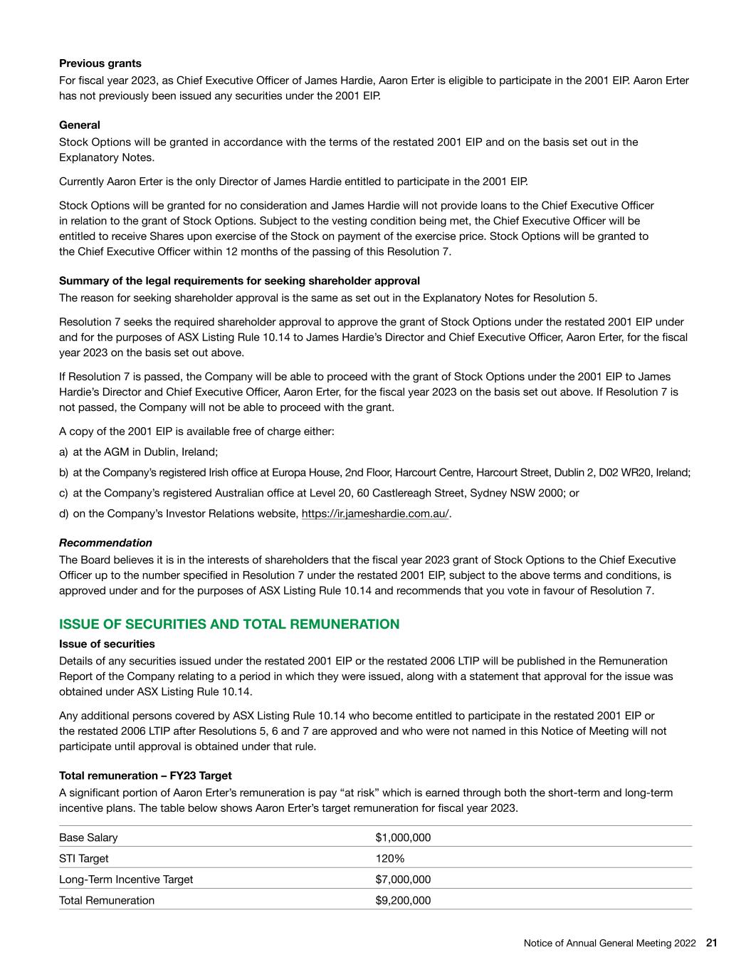 Notice of Annual General Meeting 2022 21 Previous grants For fiscal year 2023, as Chief Executive Officer of James Hardie, Aaron Erter is eligible to participate in the 2001 EIP. Aaron Erter has not previously been issued any securities under the 2001 EIP. General Stock Options will be granted in accordance with the terms of the restated 2001 EIP and on the basis set out in the Explanatory Notes. Currently Aaron Erter is the only Director of James Hardie entitled to participate in the 2001 EIP. Stock Options will be granted for no consideration and James Hardie will not provide loans to the Chief Executive Officer in relation to the grant of Stock Options. Subject to the vesting condition being met, the Chief Executive Officer will be entitled to receive Shares upon exercise of the Stock on payment of the exercise price. Stock Options will be granted to the Chief Executive Officer within 12 months of the passing of this Resolution 7. Summary of the legal requirements for seeking shareholder approval The reason for seeking shareholder approval is the same as set out in the Explanatory Notes for Resolution 5. Resolution 7 seeks the required shareholder approval to approve the grant of Stock Options under the restated 2001 EIP under and for the purposes of ASX Listing Rule 10.14 to James Hardie’s Director and Chief Executive Officer, Aaron Erter, for the fiscal year 2023 on the basis set out above. If Resolution 7 is passed, the Company will be able to proceed with the grant of Stock Options under the 2001 EIP to James Hardie’s Director and Chief Executive Officer, Aaron Erter, for the fiscal year 2023 on the basis set out above. If Resolution 7 is not passed, the Company will not be able to proceed with the grant. A copy of the 2001 EIP is available free of charge either: a) at the AGM in Dublin, Ireland; b) at the Company’s registered Irish office at Europa House, 2nd Floor, Harcourt Centre, Harcourt Street, Dublin 2, D02 WR20, Ireland; c) at the Company’s registered Australian office at Level 20, 60 Castlereagh Street, Sydney NSW 2000; or d) on the Company’s Investor Relations website, https://ir.jameshardie.com.au/. Recommendation The Board believes it is in the interests of shareholders that the fiscal year 2023 grant of Stock Options to the Chief Executive Officer up to the number specified in Resolution 7 under the restated 2001 EIP, subject to the above terms and conditions, is approved under and for the purposes of ASX Listing Rule 10.14 and recommends that you vote in favour of Resolution 7. ISSUE OF SECURITIES AND TOTAL REMUNERATION Issue of securities Details of any securities issued under the restated 2001 EIP or the restated 2006 LTIP will be published in the Remuneration Report of the Company relating to a period in which they were issued, along with a statement that approval for the issue was obtained under ASX Listing Rule 10.14. Any additional persons covered by ASX Listing Rule 10.14 who become entitled to participate in the restated 2001 EIP or the restated 2006 LTIP after Resolutions 5, 6 and 7 are approved and who were not named in this Notice of Meeting will not participate until approval is obtained under that rule. Total remuneration – FY23 Target A significant portion of Aaron Erter’s remuneration is pay “at risk” which is earned through both the short-term and long-term incentive plans. The table below shows Aaron Erter’s target remuneration for fiscal year 2023. Base Salary $1,000,000 STI Target 120% Long-Term Incentive Target $7,000,000 Total Remuneration $9,200,000