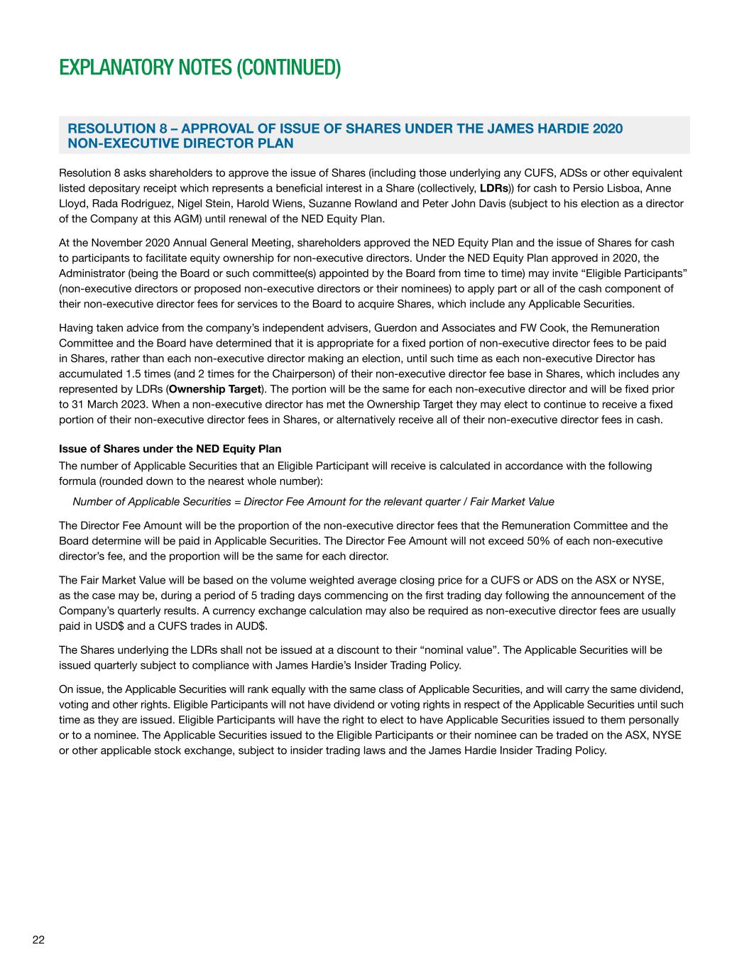 22 EXPLANATORY NOTES (CONTINUED) RESOLUTION 8 – APPROVAL OF ISSUE OF SHARES UNDER THE JAMES HARDIE 2020 NON-EXECUTIVE DIRECTOR PLAN Resolution 8 asks shareholders to approve the issue of Shares (including those underlying any CUFS, ADSs or other equivalent listed depositary receipt which represents a beneficial interest in a Share (collectively, LDRs)) for cash to Persio Lisboa, Anne Lloyd, Rada Rodriguez, Nigel Stein, Harold Wiens, Suzanne Rowland and Peter John Davis (subject to his election as a director of the Company at this AGM) until renewal of the NED Equity Plan. At the November 2020 Annual General Meeting, shareholders approved the NED Equity Plan and the issue of Shares for cash to participants to facilitate equity ownership for non-executive directors. Under the NED Equity Plan approved in 2020, the Administrator (being the Board or such committee(s) appointed by the Board from time to time) may invite “Eligible Participants” (non-executive directors or proposed non-executive directors or their nominees) to apply part or all of the cash component of their non-executive director fees for services to the Board to acquire Shares, which include any Applicable Securities. Having taken advice from the company’s independent advisers, Guerdon and Associates and FW Cook, the Remuneration Committee and the Board have determined that it is appropriate for a fixed portion of non-executive director fees to be paid in Shares, rather than each non-executive director making an election, until such time as each non-executive Director has accumulated 1.5 times (and 2 times for the Chairperson) of their non-executive director fee base in Shares, which includes any represented by LDRs (Ownership Target). The portion will be the same for each non-executive director and will be fixed prior to 31 March 2023. When a non-executive director has met the Ownership Target they may elect to continue to receive a fixed portion of their non-executive director fees in Shares, or alternatively receive all of their non-executive director fees in cash. Issue of Shares under the NED Equity Plan The number of Applicable Securities that an Eligible Participant will receive is calculated in accordance with the following formula (rounded down to the nearest whole number): Number of Applicable Securities = Director Fee Amount for the relevant quarter / Fair Market Value The Director Fee Amount will be the proportion of the non-executive director fees that the Remuneration Committee and the Board determine will be paid in Applicable Securities. The Director Fee Amount will not exceed 50% of each non-executive director’s fee, and the proportion will be the same for each director. The Fair Market Value will be based on the volume weighted average closing price for a CUFS or ADS on the ASX or NYSE, as the case may be, during a period of 5 trading days commencing on the first trading day following the announcement of the Company’s quarterly results. A currency exchange calculation may also be required as non-executive director fees are usually paid in USD$ and a CUFS trades in AUD$. The Shares underlying the LDRs shall not be issued at a discount to their “nominal value”. The Applicable Securities will be issued quarterly subject to compliance with James Hardie’s Insider Trading Policy. On issue, the Applicable Securities will rank equally with the same class of Applicable Securities, and will carry the same dividend, voting and other rights. Eligible Participants will not have dividend or voting rights in respect of the Applicable Securities until such time as they are issued. Eligible Participants will have the right to elect to have Applicable Securities issued to them personally or to a nominee. The Applicable Securities issued to the Eligible Participants or their nominee can be traded on the ASX, NYSE or other applicable stock exchange, subject to insider trading laws and the James Hardie Insider Trading Policy.