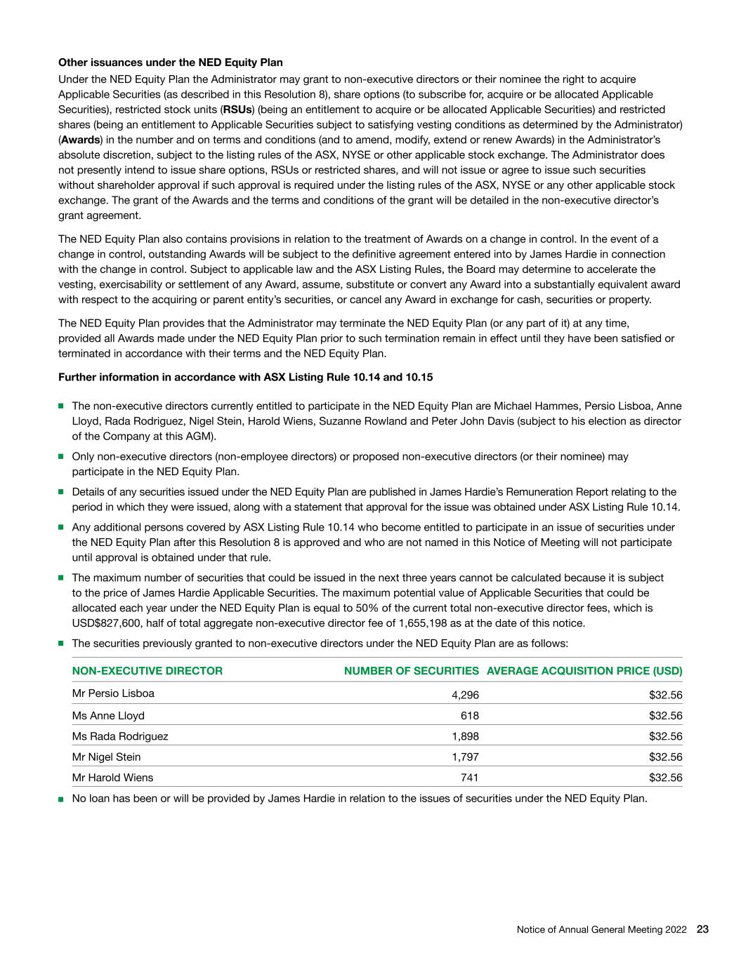 Notice of Annual General Meeting 2022 23 Other issuances under the NED Equity Plan Under the NED Equity Plan the Administrator may grant to non-executive directors or their nominee the right to acquire Applicable Securities (as described in this Resolution 8), share options (to subscribe for, acquire or be allocated Applicable Securities), restricted stock units (RSUs) (being an entitlement to acquire or be allocated Applicable Securities) and restricted shares (being an entitlement to Applicable Securities subject to satisfying vesting conditions as determined by the Administrator) (Awards) in the number and on terms and conditions (and to amend, modify, extend or renew Awards) in the Administrator’s absolute discretion, subject to the listing rules of the ASX, NYSE or other applicable stock exchange. The Administrator does not presently intend to issue share options, RSUs or restricted shares, and will not issue or agree to issue such securities without shareholder approval if such approval is required under the listing rules of the ASX, NYSE or any other applicable stock exchange. The grant of the Awards and the terms and conditions of the grant will be detailed in the non-executive director’s grant agreement. The NED Equity Plan also contains provisions in relation to the treatment of Awards on a change in control. In the event of a change in control, outstanding Awards will be subject to the definitive agreement entered into by James Hardie in connection with the change in control. Subject to applicable law and the ASX Listing Rules, the Board may determine to accelerate the vesting, exercisability or settlement of any Award, assume, substitute or convert any Award into a substantially equivalent award with respect to the acquiring or parent entity’s securities, or cancel any Award in exchange for cash, securities or property. The NED Equity Plan provides that the Administrator may terminate the NED Equity Plan (or any part of it) at any time, provided all Awards made under the NED Equity Plan prior to such termination remain in effect until they have been satisfied or terminated in accordance with their terms and the NED Equity Plan. Further information in accordance with ASX Listing Rule 10.14 and 10.15 The non-executive directors currently entitled to participate in the NED Equity Plan are Michael Hammes, Persio Lisboa, Anne Lloyd, Rada Rodriguez, Nigel Stein, Harold Wiens, Suzanne Rowland and Peter John Davis (subject to his election as director of the Company at this AGM). Only non-executive directors (non-employee directors) or proposed non-executive directors (or their nominee) may participate in the NED Equity Plan. Details of any securities issued under the NED Equity Plan are published in James Hardie’s Remuneration Report relating to the period in which they were issued, along with a statement that approval for the issue was obtained under ASX Listing Rule 10.14. Any additional persons covered by ASX Listing Rule 10.14 who become entitled to participate in an issue of securities under the NED Equity Plan after this Resolution 8 is approved and who are not named in this Notice of Meeting will not participate until approval is obtained under that rule. The maximum number of securities that could be issued in the next three years cannot be calculated because it is subject to the price of James Hardie Applicable Securities. The maximum potential value of Applicable Securities that could be allocated each year under the NED Equity Plan is equal to 50% of the current total non-executive director fees, which is USD$827,600, half of total aggregate non-executive director fee of 1,655,198 as at the date of this notice. The securities previously granted to non-executive directors under the NED Equity Plan are as follows: NON-EXECUTIVE DIRECTOR NUMBER OF SECURITIES AVERAGE ACQUISITION PRICE (USD) Mr Persio Lisboa 4,296 $32.56 Ms Anne Lloyd 618 $32.56 Ms Rada Rodriguez 1,898 $32.56 Mr Nigel Stein 1,797 $32.56 Mr Harold Wiens 741 $32.56 No loan has been or will be provided by James Hardie in relation to the issues of securities under the NED Equity Plan.