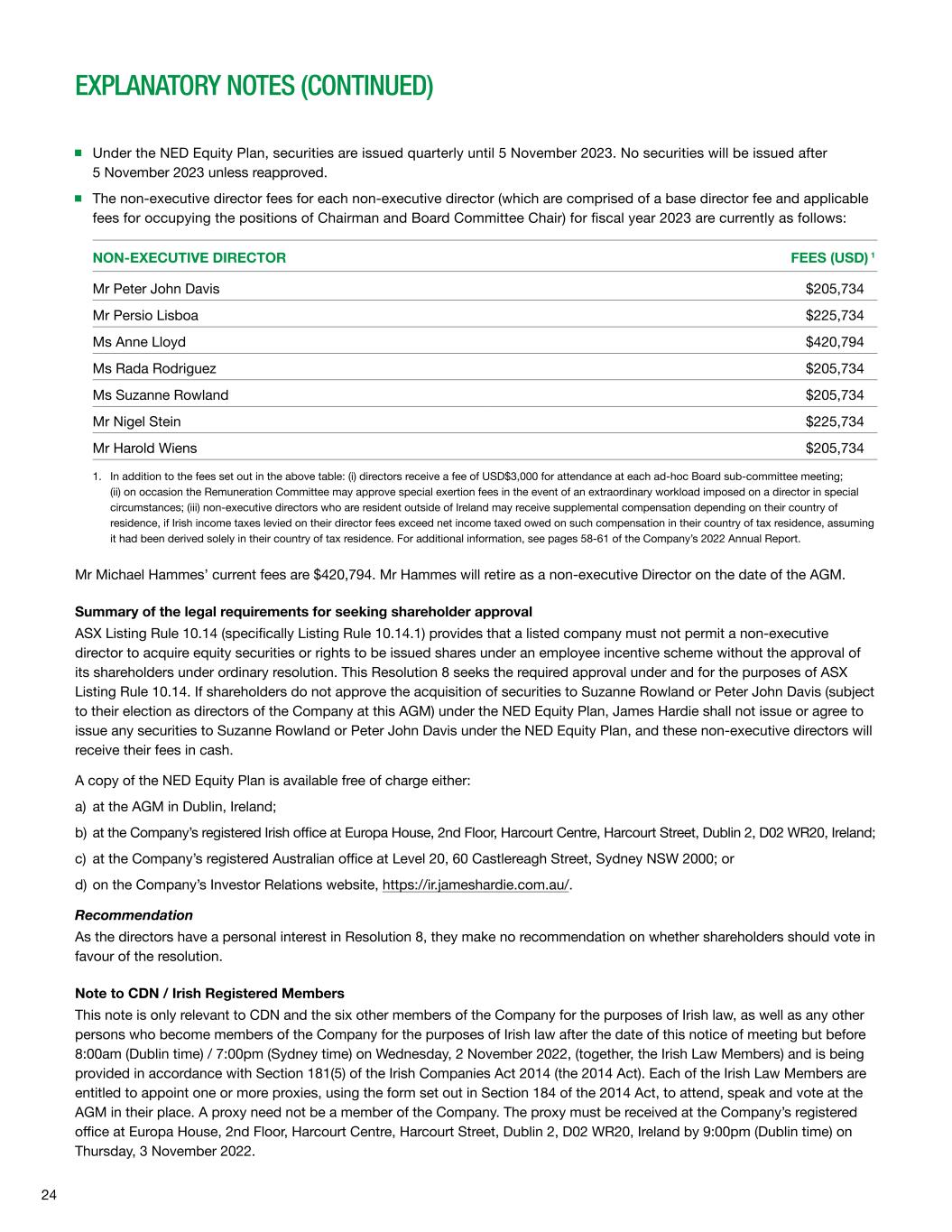 24 EXPLANATORY NOTES (CONTINUED) Under the NED Equity Plan, securities are issued quarterly until 5 November 2023. No securities will be issued after 5 November 2023 unless reapproved. The non-executive director fees for each non-executive director (which are comprised of a base director fee and applicable fees for occupying the positions of Chairman and Board Committee Chair) for fiscal year 2023 are currently as follows: NON-EXECUTIVE DIRECTOR FEES (USD) 1 Mr Peter John Davis $205,734 Mr Persio Lisboa $225,734 Ms Anne Lloyd $420,794 Ms Rada Rodriguez $205,734 Ms Suzanne Rowland $205,734 Mr Nigel Stein $225,734 Mr Harold Wiens $205,734 1. In addition to the fees set out in the above table: (i) directors receive a fee of USD$3,000 for attendance at each ad-hoc Board sub-committee meeting; (ii) on occasion the Remuneration Committee may approve special exertion fees in the event of an extraordinary workload imposed on a director in special circumstances; (iii) non-executive directors who are resident outside of Ireland may receive supplemental compensation depending on their country of residence, if Irish income taxes levied on their director fees exceed net income taxed owed on such compensation in their country of tax residence, assuming it had been derived solely in their country of tax residence. For additional information, see pages 58-61 of the Company’s 2022 Annual Report. Mr Michael Hammes’ current fees are $420,794. Mr Hammes will retire as a non-executive Director on the date of the AGM. Summary of the legal requirements for seeking shareholder approval ASX Listing Rule 10.14 (specifically Listing Rule 10.14.1) provides that a listed company must not permit a non-executive director to acquire equity securities or rights to be issued shares under an employee incentive scheme without the approval of its shareholders under ordinary resolution. This Resolution 8 seeks the required approval under and for the purposes of ASX Listing Rule 10.14. If shareholders do not approve the acquisition of securities to Suzanne Rowland or Peter John Davis (subject to their election as directors of the Company at this AGM) under the NED Equity Plan, James Hardie shall not issue or agree to issue any securities to Suzanne Rowland or Peter John Davis under the NED Equity Plan, and these non-executive directors will receive their fees in cash. A copy of the NED Equity Plan is available free of charge either: a) at the AGM in Dublin, Ireland; b) at the Company’s registered Irish office at Europa House, 2nd Floor, Harcourt Centre, Harcourt Street, Dublin 2, D02 WR20, Ireland; c) at the Company’s registered Australian office at Level 20, 60 Castlereagh Street, Sydney NSW 2000; or d) on the Company’s Investor Relations website, https://ir.jameshardie.com.au/. Recommendation As the directors have a personal interest in Resolution 8, they make no recommendation on whether shareholders should vote in favour of the resolution. Note to CDN / Irish Registered Members This note is only relevant to CDN and the six other members of the Company for the purposes of Irish law, as well as any other persons who become members of the Company for the purposes of Irish law after the date of this notice of meeting but before 8:00am (Dublin time) / 7:00pm (Sydney time) on Wednesday, 2 November 2022, (together, the Irish Law Members) and is being provided in accordance with Section 181(5) of the Irish Companies Act 2014 (the 2014 Act). Each of the Irish Law Members are entitled to appoint one or more proxies, using the form set out in Section 184 of the 2014 Act, to attend, speak and vote at the AGM in their place. A proxy need not be a member of the Company. The proxy must be received at the Company’s registered office at Europa House, 2nd Floor, Harcourt Centre, Harcourt Street, Dublin 2, D02 WR20, Ireland by 9:00pm (Dublin time) on Thursday, 3 November 2022.