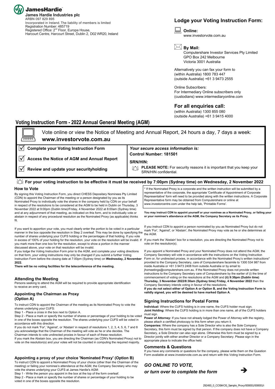 SRN/HIN: * If the Nominated Proxy is a corporate and the written instruction will be submitted by a representative of the corporate, the appropriate 'Certificate of Appointment of Corporate Representative' form will need to be provided along with the written instructions. A Corporate Representative form may be obtained from Computershare or online at www.investorcentre.com under the help tab, 'Printable Forms'. If you want to apportion your vote, you must clearly enter the portion to be voted in a particular manner in the box opposite the resolution in Step 2 overleaf. This may be done by specifying the number of shares underlying your CUFS holding or the percentages of that holding. If you vote in excess of 100% of your holding for the resolution, your vote on the resolution will be invalid. If you mark more than one box for the resolution, except to show a portion in the manner discussed above, your vote on that resolution will be invalid. If you lodge the Voting Instruction Form prior to the AGM, and complete your voting directions on that form, your voting instructions may only be changed if you submit a further Voting Instruction Form before the closing date at 7:00pm (Sydney time) on Wednesday, 2 November 2022. There will be no voting facilities for the teleconference of the meeting. If you instruct CDN to appoint a person nominated by you as Nominated Proxy but do not mark 'For', 'Against', or 'Abstain', the Nominated Proxy may vote as he or she determines at the AGM. To instruct CDN to appoint the Chairman of the meeting as its Nominated Proxy to vote the shares underlying your CUFS: Step 1 - Place a cross in the box next to Option A. Step 2 - Place a mark or specify the number of shares or percentage of your holding to be voted in one of the boxes opposite the resolution. The shares underlying your CUFS will be voted in accordance with this direction. If you do not mark 'For', 'Against', or 'Abstain' in respect of resolutions 1, 2, 3, 4, 5, 6, 7 and 8 you acknowledge that the Chairman of the meeting will vote as he or she decides. The Chairman intends to vote undirected proxies in favour of each of these resolution. If you mark the Abstain box, you are directing the Chairman (as CDN's Nominated Proxy) not to vote on the resolution(s) and your votes will not be counted in computing the required majority. Persons seeking to attend the AGM will be required to provide appropriate identification to receive an entry card. Individual: Where the CUFS holding is in one name, the CUFS holder must sign. Joint Holding: Where the CUFS holding is in more than one name, all of the CUFS holders must sign. Power of Attorney: If you have not already lodged the Power of Attorney with the registry, please attach a certified photocopy to this form when you return it. Companies: Where the company has a Sole Director who is also the Sole Company Secretary, this form must be signed by that person. If the company does not have a Company Secretary, a Sole Director can also sign alone. Otherwise this form must be signed by a Director jointly with either another Director or a Company Secretary. Please sign in the appropriate place to indicate the office held. To instruct CDN to appoint a Nominated Proxy of your choice (other than the Chairman of the meeting) or failing your nominee’s attendance at the AGM, the Company Secretary who may vote the shares underlying your CUFS at James Hardie's AGM: Step 1 - Write the person you appoint in the box at the top of the form overleaf. Step 2 - Place a mark or specify the number of shares or percentage of your holding to be voted in one of the boxes opposite the resolution. If you have any comments or questions for the company, please write them on the Question Form available at www.investorvote.com.au and return with this Voting Instruction Form. Lodge your Voting Instruction Form: Online: www.investorvote.com.au By Mail: Computershare Investor Services Pty Limited GPO Box 242 Melbourne Victoria 3001 Australia Alternatively you can fax your form to (within Australia) 1800 783 447 (outside Australia) +61 3 9473 2555 For all enquiries call: (within Australia) 1300 855 080 (outside Australia) +61 3 9415 4000 Voting Instruction Form - 2022 Annual General Meeting (AGM) For your voting instruction to be effective it must be received by 7:00pm (Sydney time) on Wednesday, 2 November 2022 How to Vote Signing Instructions for Postal Forms GO ONLINE TO VOTE, or turn over to complete the form Control Number: 181501 www.investorvote.com.au Vote online or view the Notice of Meeting and Annual Report, 24 hours a day, 7 days a week: Complete your Voting Instruction Form Access the Notice of AGM and Annual Report Review and update your securityholding Your secure access information is: PLEASE NOTE: For security reasons it is important that you keep your SRN/HIN confidential. By signing this Voting Instruction Form, you direct CHESS Depositary Nominees Pty Limited (CDN) to appoint the Chairman of the meeting or a person designated by you as its Nominated Proxy to individually vote the shares in the company held by CDN on your behalf in respect of the resolutions to be considered at the AGM to be held in Dublin on Thursday, 3 November 2022 at 9:00pm (Dublin time)/Friday, 4 November 2022 at 8:00am (Sydney time) and at any adjournment of that meeting, as indicated on this form, and to individually vote or abstain in respect of any procedural resolution as the Nominated Proxy (as applicable) thinks fit. Appointing the Chairman as Proxy (Option A) Appointing a proxy of your choice 'Nominated Proxy' (Option B) Attending the Meeting Online Subscribers: For Intermediary Online subscribers only (custodians) www.intermediaryonline.com Comments & Questions If you mark the 'Abstain' box for a resolution, you are directing the Nominated Proxy not to vote on the resolution(s). If you appoint a Nominated Proxy and your Nominated Proxy does not attend the AGM, the Company Secretary will vote in ac