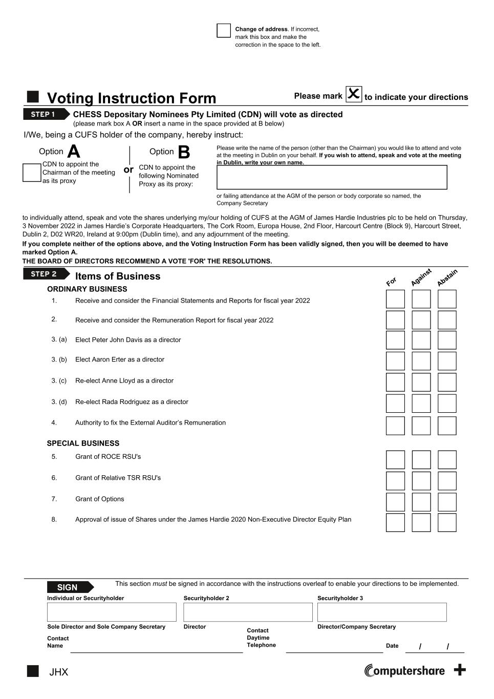 Change of address. If incorrect, mark this box and make the correction in the space to the left. Voting Instruction Form Please mark to indicate your directions CHESS Depositary Nominees Pty Limited (CDN) will vote as directedSTEP 1 to individually attend, speak and vote the shares underlying my/our holding of CUFS at the AGM of James Hardie Industries plc to be held on Thursday, 3 November 2022 in James Hardie’s Corporate Headquarters, The Cork Room, Europa House, 2nd Floor, Harcourt Centre (Block 9), Harcourt Street, Dublin 2, D02 WR20, Ireland at 9:00pm (Dublin time), and any adjournment of the meeting. STEP 2 Items of Business This section must be signed in accordance with the instructions overleaf to enable your directions to be implemented. Individual or Securityholder Contact Name Contact Daytime Telephone Date ORDINARY BUSINESS 8. / / 1. 2. 3. (a) 3. (b) Receive and consider the Financial Statements and Reports for fiscal year 2022 Receive and consider the Remuneration Report for fiscal year 2022 Elect Peter John Davis as a director Elect Aaron Erter as a director Approval of issue of Shares under the James Hardie 2020 Non-Executive Director Equity Plan Authority to fix the External Auditor’s Remuneration4. Securityholder 2 Securityholder 3 Sole Director and Sole Company Secretary Director Director/Company Secretary Option A B CDN to appoint the Chairman of the meeting as its proxy Option or CDN to appoint the following Nominated Proxy as its proxy: I/We, being a CUFS holder of the company, hereby instruct: THE BOARD OF DIRECTORS RECOMMEND A VOTE 'FOR' THE RESOLUTIONS. If you complete neither of the options above, and the Voting Instruction Form has been validly signed, then you will be deemed to have marked Option A. Please write the name of the person (other than the Chairman) you would like to attend and vote at the meeting in Dublin on your behalf. If you wish to attend, speak and vote at the meeting in Dublin, write your own name. (please mark box A OR insert a name in the space provided at B below) SIGN or failing attendance at the AGM of the person or body corporate so named, the Company Secretary 5. Grant of ROCE RSU's SPECIAL BUSINESS 6. Grant of Relative TSR RSU's 3. (c) Re-elect Anne Lloyd as a director 3. (d) Re-elect Rada Rodriguez as a director 7. Grant of Options JHX
