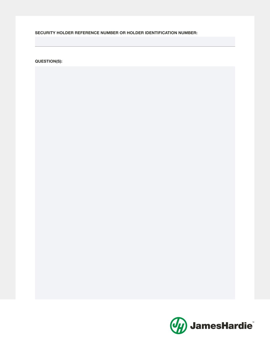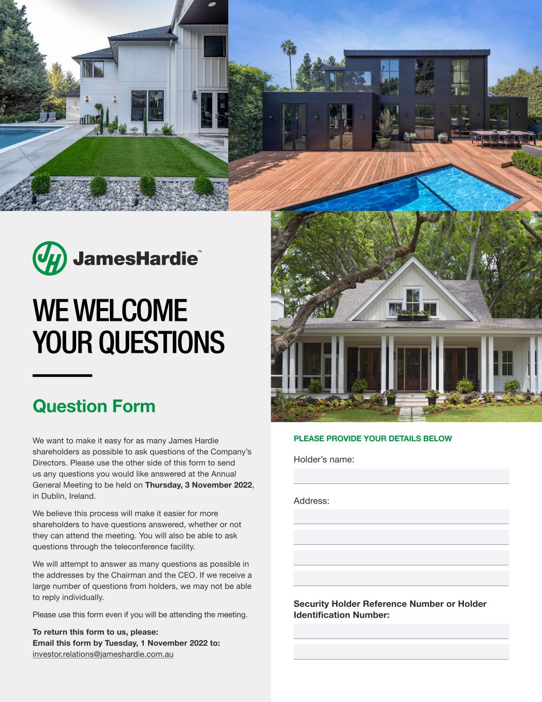 Question Form We want to make it easy for as many James Hardie shareholders as possible to ask questions of the Company’s Directors. Please use the other side of this form to send us any questions you would like answered at the Annual General Meeting to be held on Thursday, 3 November 2022, in Dublin, Ireland. We believe this process will make it easier for more shareholders to have questions answered, whether or not they can attend the meeting. You will also be able to ask questions through the teleconference facility. We will attempt to answer as many questions as possible in the addresses by the Chairman and the CEO. If we receive a large number of questions from holders, we may not be able to reply individually. Please use this form even if you will be attending the meeting. To return this form to us, please: Email this form by Tuesday, 1 November 2022 to: [email protected] PLEASE PROVIDE YOUR DETAILS BELOW Holder’s name: Address: Security Holder Reference Number or Holder Identification Number: WE WELCOME YOUR QUESTIONS