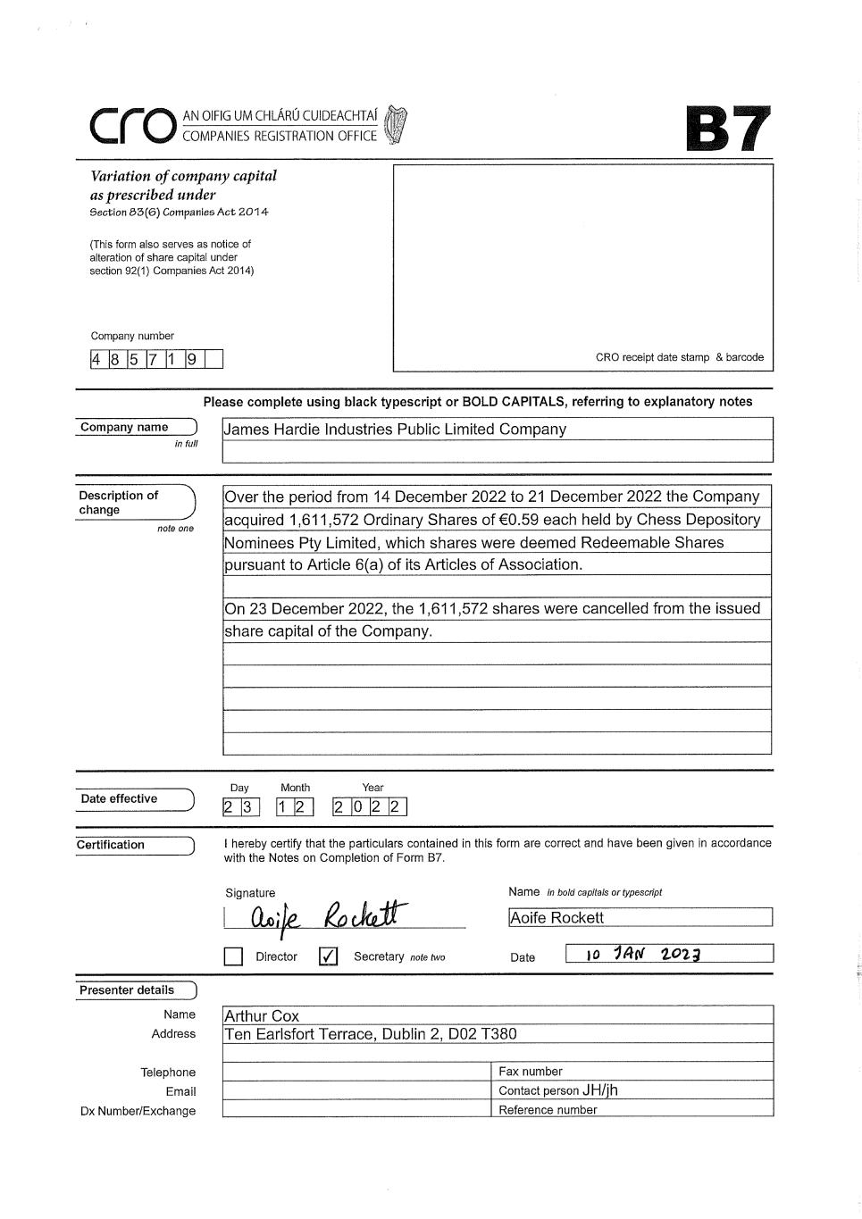 James Hardie Industries plc Europa House 2nd Floor, Harcourt Centre Harcourt Street, Dublin 2, D02 WR20, Ireland T: +353 (0) 1 411 6924 F: +353 (0) 1 479 1128 James Hardie Industries plc is a limited liability company incorporated in Ireland with its registered office at Europa House 2nd Floor, Harcourt Centre, Harcourt Street, Dublin 2, D02 WR20, Ireland. Directors: Anne Lloyd (Chairperson, USA), Peter-John Davis (Aus), Persio Lisboa (USA), Renee Peterson (USA), Rada Rodriguez (Sweden), Suzanne B. Rowland (USA), Nigel Stein (UK), Harold Wiens (USA). Chief Executive Officer and Director: Aaron Erter (USA) Company number: 485719 ARBN: 097 829 895 16 January 2023 The Manager Company Announcements Office Australian Securities Exchange Limited 20 Bridge Street SYDNEY NSW 2000 Dear Sir/Madam Enclosed is a copy of Irish Companies Registration Office Form B7 in respect of the cancellation of 1,611,572 ordinary shares in James Hardie Industries plc. (James Hardie) as part of the on-market share buy-back. Following this cancellation, James Hardie’s issued capital is 444,246,402 ordinary shares. Regards Aoife Rockett Company Secretary This announcement has been authorised for release by the Chief Financial Officer, Mr Jason Miele.