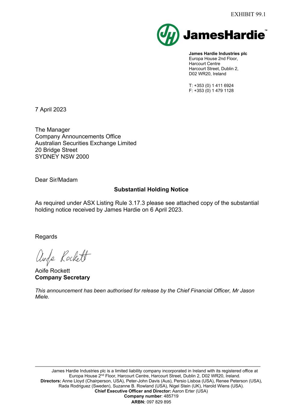 James Hardie Industries plc Europa House 2nd Floor, Harcourt Centre Harcourt Street, Dublin 2, D02 WR20, Ireland T: +353 (0) 1 411 6924 F: +353 (0) 1 479 1128 James Hardie Industries plc is a limited liability company incorporated in Ireland with its registered office at Europa House 2nd Floor, Harcourt Centre, Harcourt Street, Dublin 2, D02 WR20, Ireland. Directors: Anne Lloyd (Chairperson, USA), Peter-John Davis (Aus), Persio Lisboa (USA), Renee Peterson (USA), Rada Rodriguez (Sweden), Suzanne B. Rowland (USA), Nigel Stein (UK), Harold Wiens (USA). Chief Executive Officer and Director: Aaron Erter (USA) Company number: 485719 ARBN: 097 829 895 7 April 2023 The Manager Company Announcements Office Australian Securities Exchange Limited 20 Bridge Street SYDNEY NSW 2000 Dear Sir/Madam Substantial Holding Notice As required under ASX Listing Rule 3.17.3 please see attached copy of the substantial holding notice received by James Hardie on 6 April 2023. Regards Aoife Rockett Company Secretary This announcement has been authorised for release by the Chief Financial Officer, Mr Jason Miele.