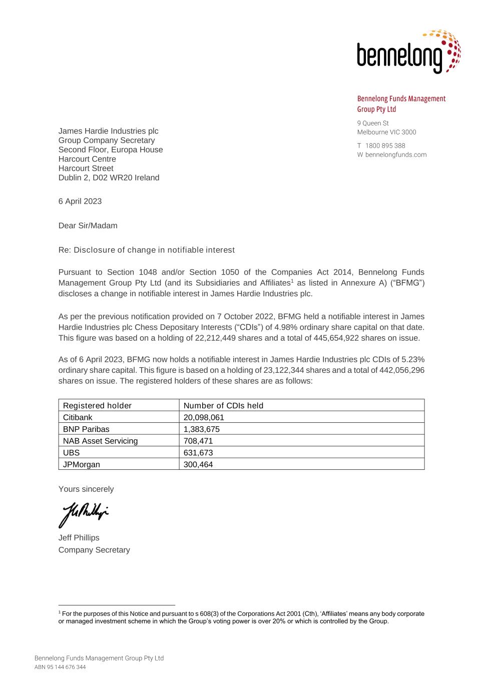 James Hardie Industries plc Group Company Secretary Second Floor, Europa House Harcourt Centre Harcourt Street Dublin 2, D02 WR20 Ireland 6 April 2023 Dear Sir/Madam Re: Disclosure of change in notifiable interest Pursuant to Section 1048 and/or Section 1050 of the Companies Act 2014, Bennelong Funds Management Group Pty Ltd (and its Subsidiaries and Affiliates1 as listed in Annexure A) (“BFMG”) discloses a change in notifiable interest in James Hardie Industries plc. As per the previous notification provided on 7 October 2022, BFMG held a notifiable interest in James Hardie Industries plc Chess Depositary Interests (“CDIs”) of 4.98% ordinary share capital on that date. This figure was based on a holding of 22,212,449 shares and a total of 445,654,922 shares on issue. As of 6 April 2023, BFMG now holds a notifiable interest in James Hardie Industries plc CDIs of 5.23% ordinary share capital. This figure is based on a holding of 23,122,344 shares and a total of 442,056,296 shares on issue. The registered holders of these shares are as follows: Registered holder Number of CDIs held Citibank 20,098,061 BNP Paribas 1,383,675 NAB Asset Servicing 708,471 UBS 631,673 JPMorgan 300,464 Yours sincerely Jeff Phillips Company Secretary 1 For the purposes of this Notice and pursuant to s 608(3) of the Corporations Act 2001 (Cth), ‘Affiliates’ means any body corporate or managed investment scheme in which the Group’s voting power is over 20% or which is controlled by the Group.