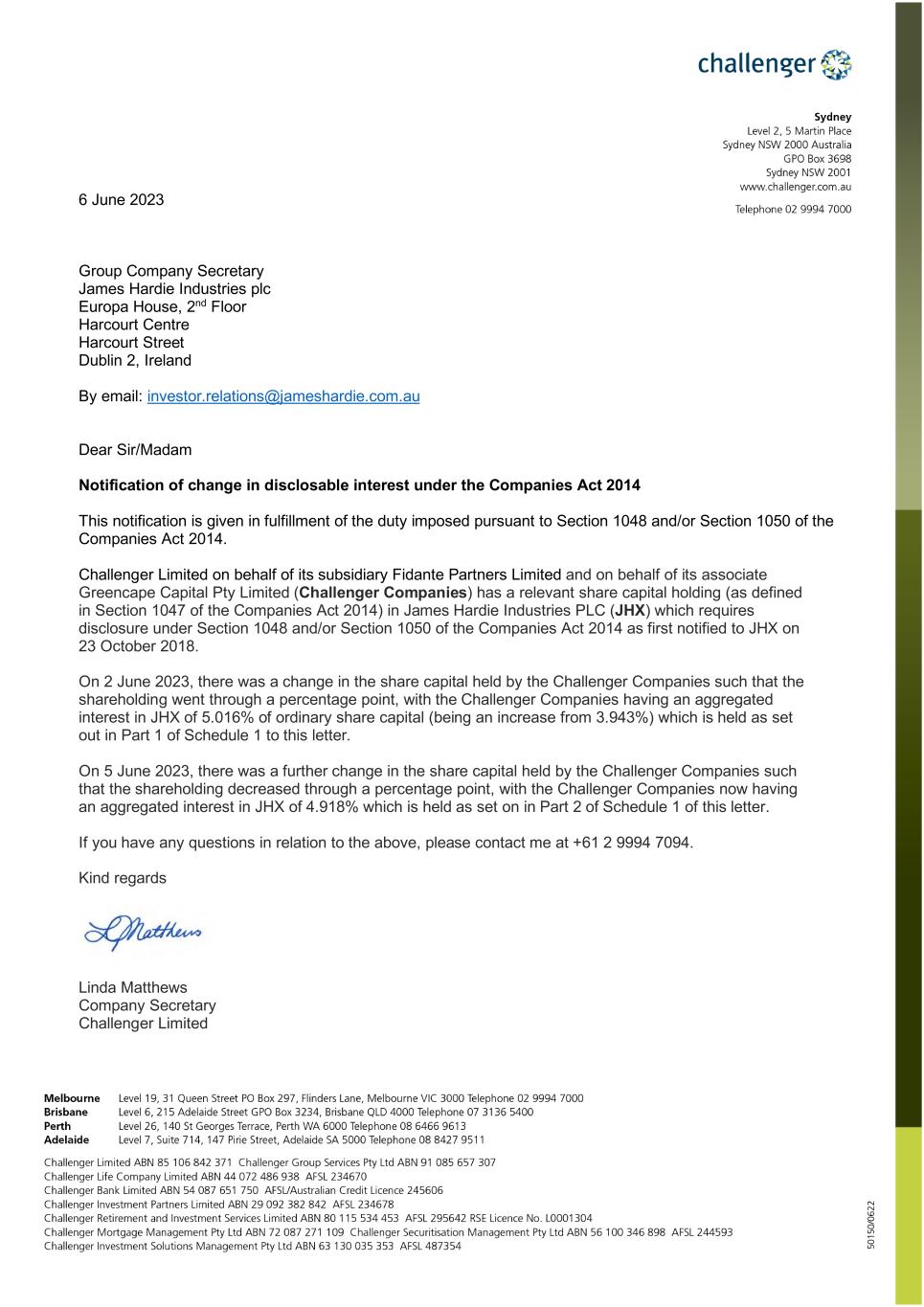 James Hardie Industries plc 1st Floor, Block A, One Park Place, Upper Hatch Street, Dublin 2, D02 FD79, Ireland T: +353 (0) 1 411 6924 F: +353 (0) 1 479 1128 James Hardie Industries plc is a limited liability company incorporated in Ireland with its registered office at 1st Floor, Block A, One Park Place, Upper Hatch Street, Dublin 2, D02 FD79, Ireland. Directors: Anne Lloyd (Chairperson, USA), Peter-John Davis (Aus), Persio Lisboa (USA), Renee Peterson (USA), Rada Rodriguez (Sweden), Suzanne B. Rowland (USA), Nigel Stein (UK), Harold Wiens (USA). Chief Executive Officer and Director: Aaron Erter (USA) Company number: 485719 ARBN: 097 829 895 9 June 2023 The Manager Company Announcements Office Australian Securities Exchange Limited 20 Bridge Street SYDNEY NSW 2000 Dear Sir/Madam Substantial Holding Notice As required under ASX Listing Rule 3.17.3 please see attached copy of the substantial holding notice received by James Hardie on 5 June 2023. Regards Aoife Rockett Company Secretary This announcement has been authorised for release by the Chief Financial Officer, Mr Jason Miele.