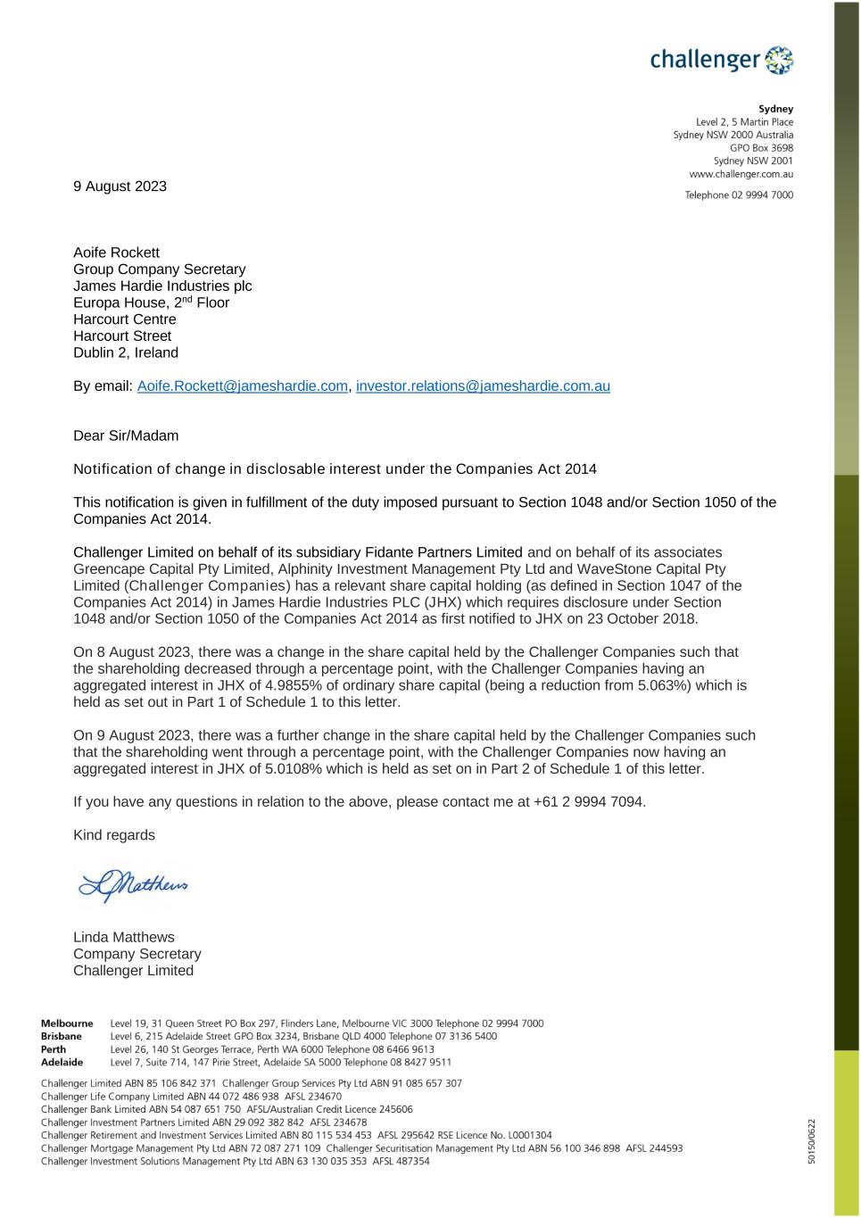James Hardie Industries plc 1st Floor, Block A, One Park Place, Upper Hatch Street, Dublin 2, D02 FD79, Ireland T: +353 (0) 1 411 6924 F: +353 (0) 1 479 1128 James Hardie Industries plc is a limited liability company incorporated in Ireland with its registered office at 1st Floor, Block A, One Park Place, Upper Hatch Street, Dublin 2, D02 FD79, Ireland. Directors: Anne Lloyd (Chairperson, USA), Peter-John Davis (Aus), Persio Lisboa (USA), Renee Peterson (USA), Rada Rodriguez (Sweden), Suzanne B. Rowland (USA), Nigel Stein (UK), Harold Wiens (USA). Chief Executive Officer and Director: Aaron Erter (USA) Company number: 485719 ARBN: 097 829 895 14 August 2023 The Manager Company Announcements Office Australian Securities Exchange Limited 20 Bridge Street SYDNEY NSW 2000 Dear Sir/Madam Substantial Holding Notice As required under ASX Listing Rule 3.17.3 please see attached copy of the substantial holding notice received by James Hardie on 11 August 2023. Regards Aoife Rockett Company Secretary This announcement has been authorised for release by the Company Secretary, Ms Aoife Rockett.