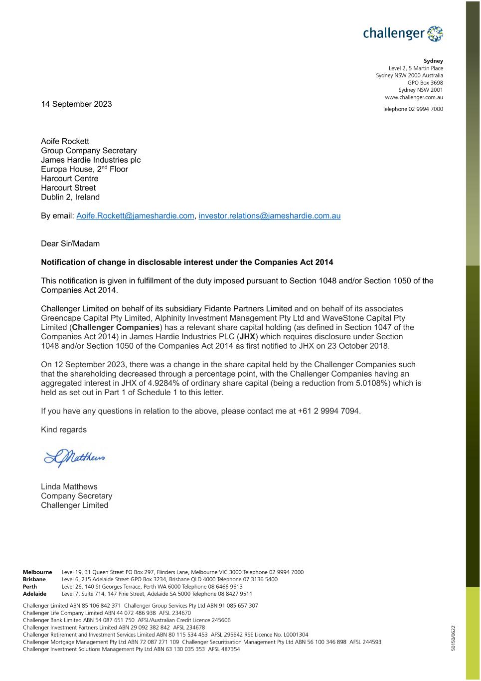 James Hardie Industries plc 1st Floor, Block A, One Park Place, Upper Hatch Street, Dublin 2, D02 FD79, Ireland T: +353 (0) 1 411 6924 F: +353 (0) 1 479 1128 James Hardie Industries plc is a limited liability company incorporated in Ireland with its registered office at 1st Floor, Block A, One Park Place, Upper Hatch Street, Dublin 2, D02 FD79, Ireland. Directors: Anne Lloyd (Chairperson, USA), Peter-John Davis (Aus), Persio Lisboa (USA), Renee Peterson (USA), Rada Rodriguez (Sweden), Suzanne B. Rowland (USA), Nigel Stein (UK), Harold Wiens (USA). Chief Executive Officer and Director: Aaron Erter (USA) Company number: 485719 ARBN: 097 829 895 18 September 2023 The Manager Company Announcements Office Australian Securities Exchange Limited 20 Bridge Street SYDNEY NSW 2000 Dear Sir/Madam Substantial Holding Notice As required under ASX Listing Rule 3.17.3 please see attached copy of the substantial holding notice received by James Hardie on 15 September 2023. Regards Aoife Rockett Company Secretary This announcement has been authorised for release by the Company Secretary, Ms Aoife Rockett. EXHIBIT 99.1