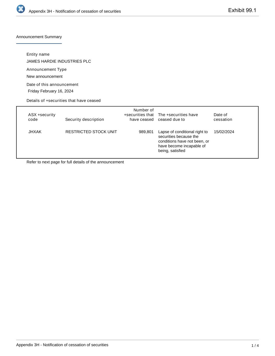 Appendix 3H - Notification of cessation of securities Appendix 3H - Notification of cessation of securities 1 / 4 Announcement Summary Entity name JAMES HARDIE INDUSTRIES PLC Announcement Type New announcement Date of this announcement Friday February 16, 2024 Details of +securities that have ceased ASX +security code Security description Number of +securities that have ceased The +securities have ceased due to Date of cessation JHXAK RESTRICTED STOCK UNIT 989,801 Lapse of conditional right to securities because the conditions have not been, or have become incapable of being, satisfied 15/02/2024 Refer to next page for full details of the announcement Exhibit 99.1