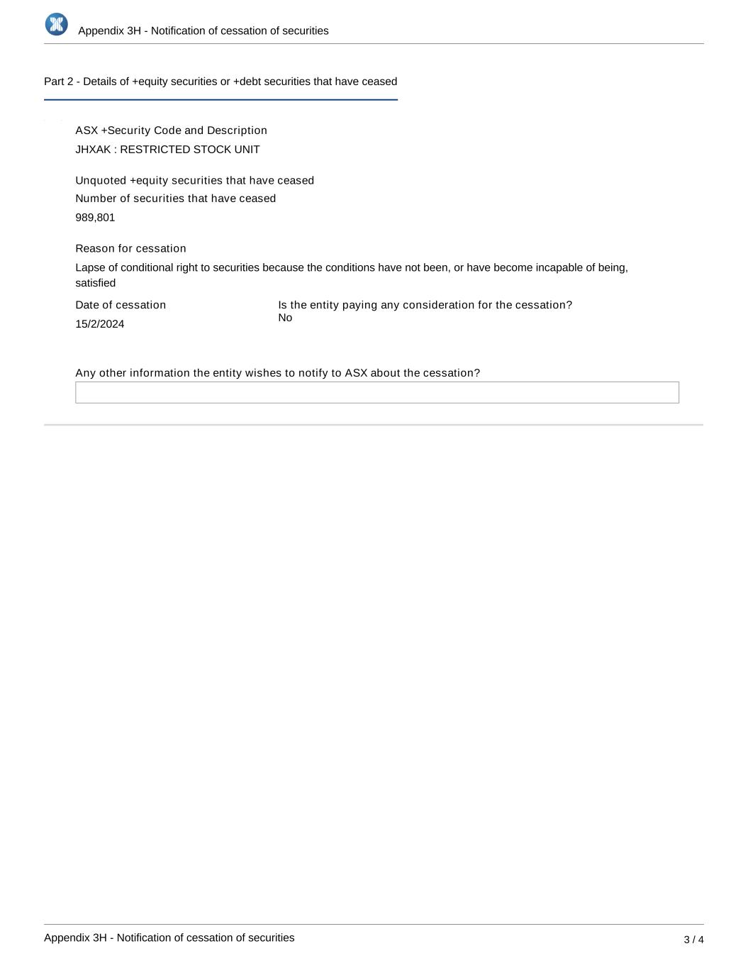 Appendix 3H - Notification of cessation of securities Appendix 3H - Notification of cessation of securities 3 / 4 Part 2 - Details of +equity securities or +debt securities that have ceased ASX +Security Code and Description JHXAK : RESTRICTED STOCK UNIT Unquoted +equity securities that have ceased Number of securities that have ceased 989,801 Reason for cessation Lapse of conditional right to securities because the conditions have not been, or have become incapable of being, satisfied Date of cessation 15/2/2024 Is the entity paying any consideration for the cessation? Any other information the entity wishes to notify to ASX about the cessation? No