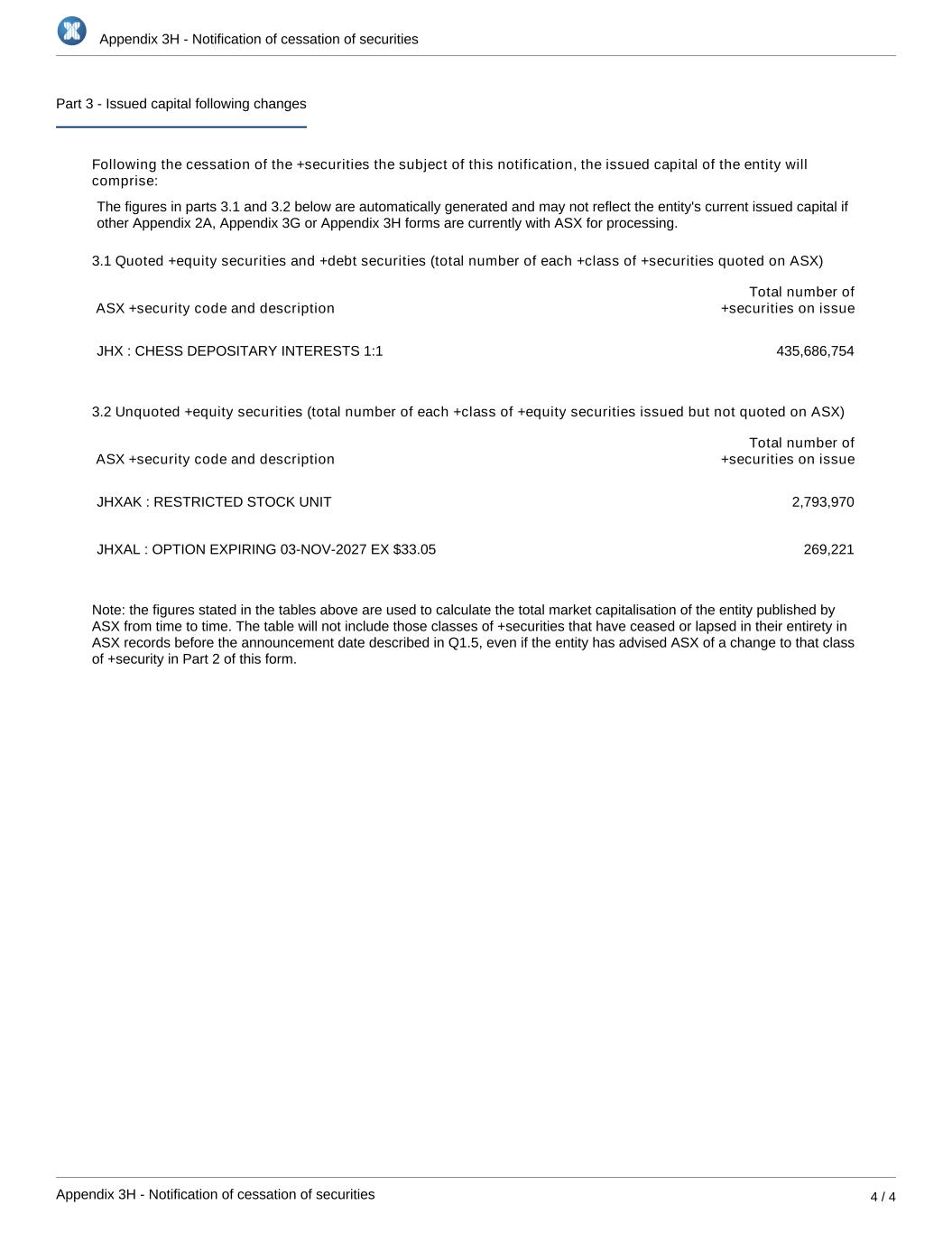 Appendix 3H - Notification of cessation of securities Appendix 3H - Notification of cessation of securities 4 / 4 Part 3 - Issued capital following changes Following the cessation of the +securities the subject of this notification, the issued capital of the entity will comprise: The figures in parts 3.1 and 3.2 below are automatically generated and may not reflect the entity's current issued capital if other Appendix 2A, Appendix 3G or Appendix 3H forms are currently with ASX for processing. 3.1 Quoted +equity securities and +debt securities (total number of each +class of +securities quoted on ASX) ASX +security code and description Total number of +securities on issue JHX : CHESS DEPOSITARY INTERESTS 1:1 435,686,754 3.2 Unquoted +equity securities (total number of each +class of +equity securities issued but not quoted on ASX) ASX +security code and description Total number of +securities on issue JHXAK : RESTRICTED STOCK UNIT 2,793,970 JHXAL : OPTION EXPIRING 03-NOV-2027 EX $33.05 269,221 Note: the figures stated in the tables above are used to calculate the total market capitalisation of the entity published by ASX from time to time. The table will not include those classes of +securities that have ceased or lapsed in their entirety in ASX records before the announcement date described in Q1.5, even if the entity has advised ASX of a change to that class of +security in Part 2 of this form.