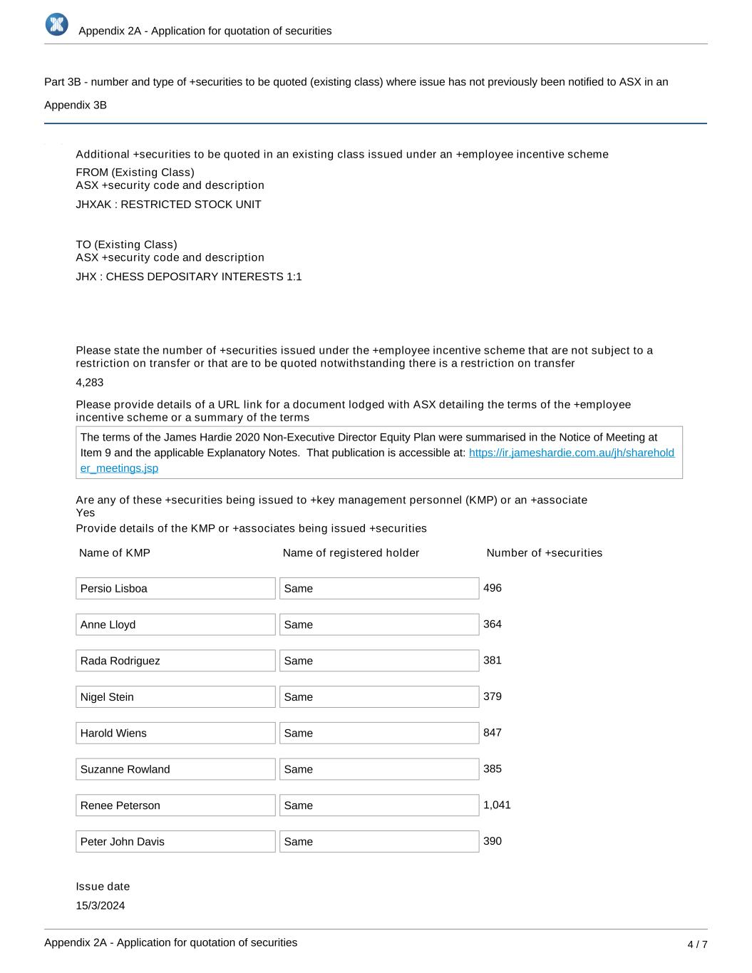 Appendix 2A - Application for quotation of securities Appendix 2A - Application for quotation of securities 4 / 7 Part 3B - number and type of +securities to be quoted (existing class) where issue has not previously been notified to ASX in an Appendix 3B Additional +securities to be quoted in an existing class issued under an +employee incentive scheme FROM (Existing Class) ASX +security code and description JHXAK : RESTRICTED STOCK UNIT TO (Existing Class) ASX +security code and description JHX : CHESS DEPOSITARY INTERESTS 1:1 Please state the number of +securities issued under the +employee incentive scheme that are not subject to a restriction on transfer or that are to be quoted notwithstanding there is a restriction on transfer 4,283 Please provide details of a URL link for a document lodged with ASX detailing the terms of the +employee incentive scheme or a summary of the terms The terms of the James Hardie 2020 Non-Executive Director Equity Plan were summarised in the Notice of Meeting at Item 9 and the applicable Explanatory Notes. That publication is accessible at: https://ir.jameshardie.com.au/jh/sharehold er_meetings.jsp Are any of these +securities being issued to +key management personnel (KMP) or an +associate Provide details of the KMP or +associates being issued +securities Name of KMP Name of registered holder Number of +securities Persio Lisboa Same 496 Anne Lloyd Same 364 Rada Rodriguez Same 381 Nigel Stein Same 379 Harold Wiens Same 847 Suzanne Rowland Same 385 Renee Peterson Same 1,041 Peter John Davis Same 390 Issue date 15/3/2024 Will the +securities to be quoted rank equally in all respects from their issue date with the existing issued Yes