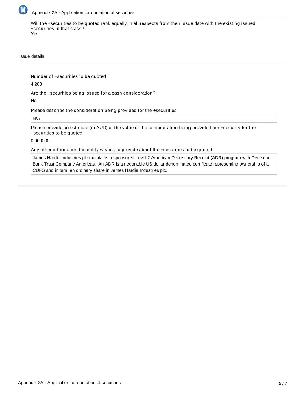 Appendix 2A - Application for quotation of securities Appendix 2A - Application for quotation of securities 5 / 7 Will the +securities to be quoted rank equally in all respects from their issue date with the existing issued +securities in that class? Issue details Number of +securities to be quoted 4,283 Are the +securities being issued for a cash consideration? Please describe the consideration being provided for the +securities N/A Please provide an estimate (in AUD) of the value of the consideration being provided per +security for the +securities to be quoted 0.000000 Any other information the entity wishes to provide about the +securities to be quoted James Hardie Industries plc maintains a sponsored Level 2 American Depositary Receipt (ADR) program with Deutsche Bank Trust Company Americas. An ADR is a negotiable US dollar denominated certificate representing ownership of a CUFS and in turn, an ordinary share in James Hardie Industries plc. No Yes