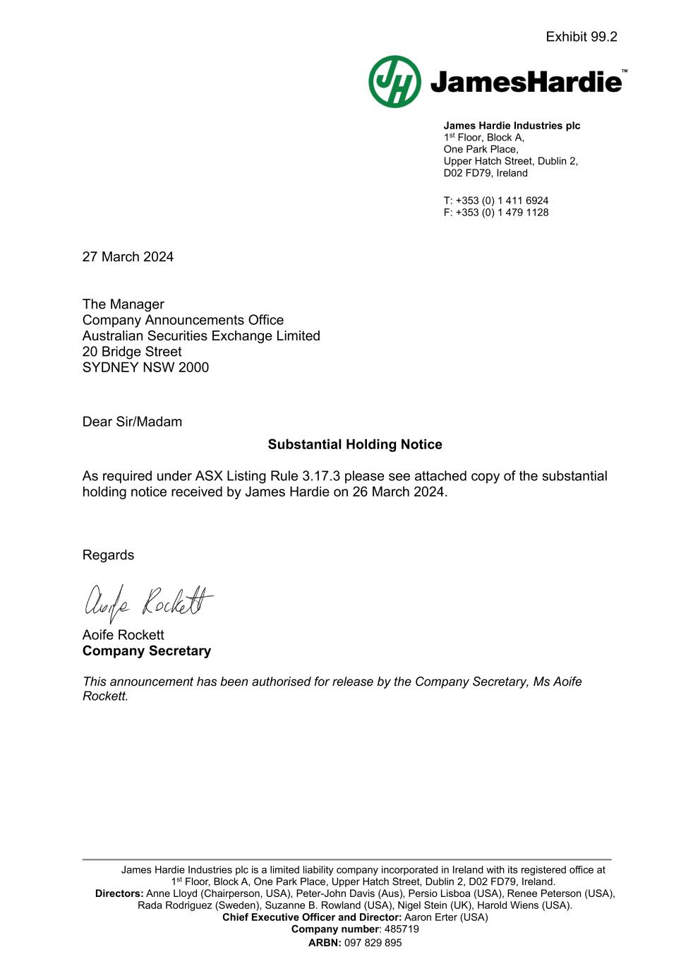 James Hardie Industries plc 1st Floor, Block A, One Park Place, Upper Hatch Street, Dublin 2, D02 FD79, Ireland T: +353 (0) 1 411 6924 F: +353 (0) 1 479 1128 James Hardie Industries plc is a limited liability company incorporated in Ireland with its registered office at 1st Floor, Block A, One Park Place, Upper Hatch Street, Dublin 2, D02 FD79, Ireland. Directors: Anne Lloyd (Chairperson, USA), Peter-John Davis (Aus), Persio Lisboa (USA), Renee Peterson (USA), Rada Rodriguez (Sweden), Suzanne B. Rowland (USA), Nigel Stein (UK), Harold Wiens (USA). Chief Executive Officer and Director: Aaron Erter (USA) Company number: 485719 ARBN: 097 829 895 27 March 2024 The Manager Company Announcements Office Australian Securities Exchange Limited 20 Bridge Street SYDNEY NSW 2000 Dear Sir/Madam Substantial Holding Notice As required under ASX Listing Rule 3.17.3 please see attached copy of the substantial holding notice received by James Hardie on 26 March 2024. Regards Aoife Rockett Company Secretary This announcement has been authorised for release by the Company Secretary, Ms Aoife Rockett. Exhibit 99.2