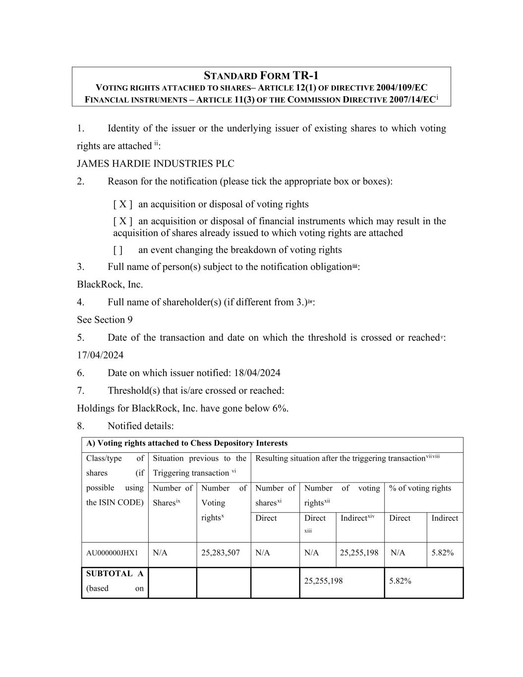 STANDARD FORM TR-1 VOTING RIGHTS ATTACHED TO SHARES– ARTICLE 12(1) OF DIRECTIVE 2004/109/EC FINANCIAL INSTRUMENTS – ARTICLE 11(3) OF THE COMMISSION DIRECTIVE 2007/14/ECi 1. Identity of the issuer or the underlying issuer of existing shares to which voting rights are attached ii: JAMES HARDIE INDUSTRIES PLC 2. Reason for the notification (please tick the appropriate box or boxes): [ X ] an acquisition or disposal of voting rights [ X ] an acquisition or disposal of financial instruments which may result in the acquisition of shares already issued to which voting rights are attached [ ] an event changing the breakdown of voting rights 3. Full name of person(s) subject to the notification obligationiii: BlackRock, Inc. 4. Full name of shareholder(s) (if different from 3.) iv: See Section 9 5. Date of the transaction and date on which the threshold is crossed or reachedv: 17/04/2024 6. Date on which issuer notified: 18/04/2024 7. Threshold(s) that is/are crossed or reached: Holdings for BlackRock, Inc. have gone below 6%. 8. Notified details: A) Voting rights attached to Chess Depository Interests Class/type of shares (if possible using the ISIN CODE) Situation previous to the Triggering transaction vi Resulting situation after the triggering transactionviiviii Number of Sharesix Number of Voting rightsx Number of sharesxi Number of voting rightsxii % of voting rights Direct Direct xiii Indirectxiv Direct Indirect AU000000JHX1 N/A 25,283,507 N/A N/A 25,255,198 N/A 5.82% SUBTOTAL A (based on 25,255,198 5.82%