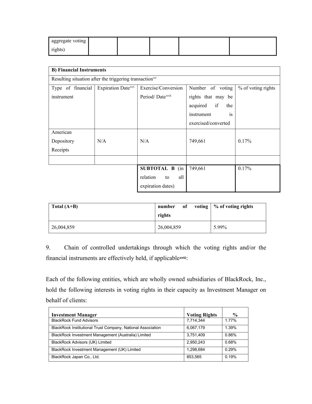 aggregate voting rights) B) Financial Instruments Resulting situation after the triggering transactionxv Type of financial instrument Expiration Datexvi Exercise/Conversion Period/ Datexvii Number of voting rights that may be acquired if the instrument is exercised/converted % of voting rights American Depository Receipts N/A N/A 749,661 0.17% SUBTOTAL B (in relation to all expiration dates) 749,661 0.17% Total (A+B) number of voting rights % of voting rights 26,004,859 26,004,859 5.99% 9. Chain of controlled undertakings through which the voting rights and/or the financial instruments are effectively held, if applicablexviii: Each of the following entities, which are wholly owned subsidiaries of BlackRock, Inc., hold the following interests in voting rights in their capacity as Investment Manager on behalf of clients: Investment Manager Voting Rights % BlackRock Fund Advisors 7,714,344 1.77% BlackRock Institutional Trust Company, National Association 6,067,179 1.39% BlackRock Investment Management (Australia) Limited 3,751,409 0.86% BlackRock Advisors (UK) Limited 2,950,243 0.68% BlackRock Investment Management (UK) Limited 1,298,684 0.29% BlackRock Japan Co., Ltd. 853,565 0.19%