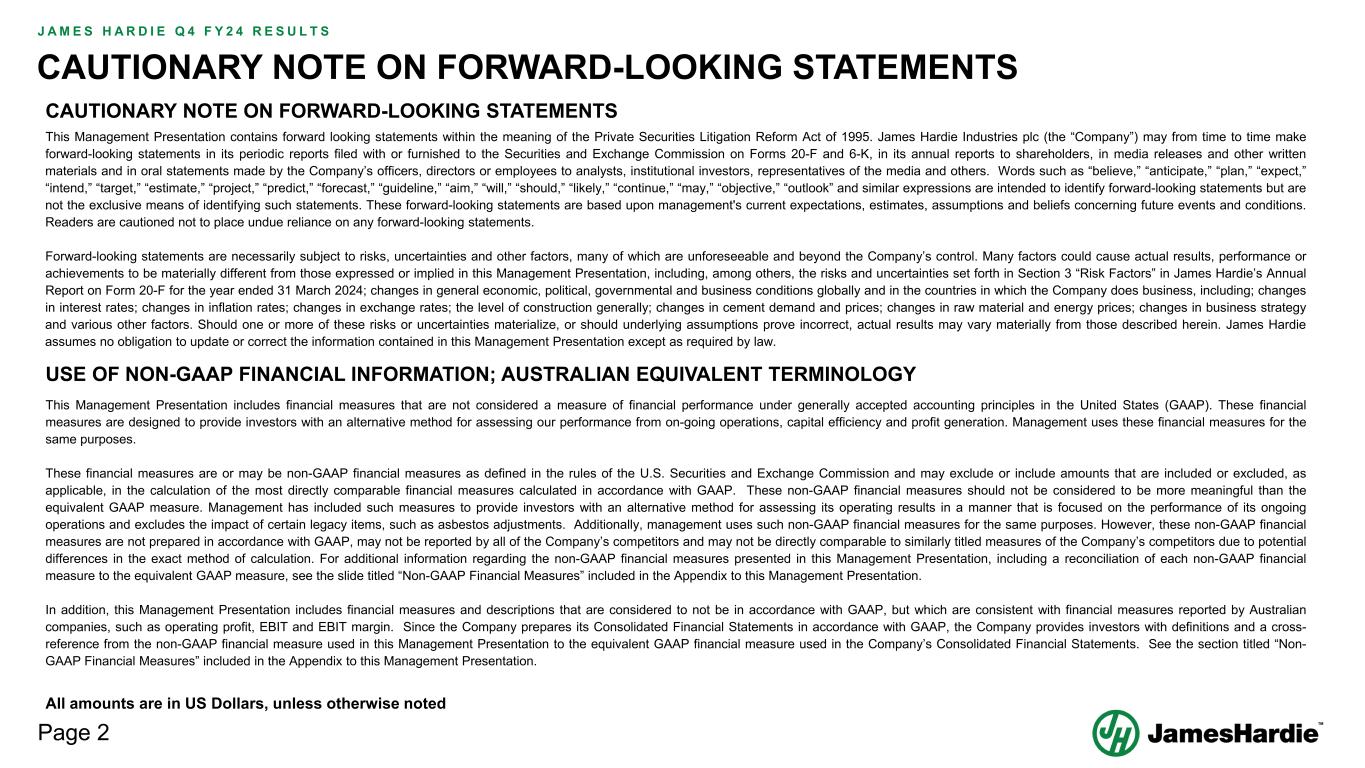 Page 2 J A M E S H A R D I E Q 4 F Y 2 4 R E S U L T S CAUTIONARY NOTE ON FORWARD-LOOKING STATEMENTS This Management Presentation contains forward looking statements within the meaning of the Private Securities Litigation Reform Act of 1995. James Hardie Industries plc (the “Company”) may from time to time make forward-looking statements in its periodic reports filed with or furnished to the Securities and Exchange Commission on Forms 20-F and 6-K, in its annual reports to shareholders, in media releases and other written materials and in oral statements made by the Company’s officers, directors or employees to analysts, institutional investors, representatives of the media and others. Words such as “believe,” “anticipate,” “plan,” “expect,” “intend,” “target,” “estimate,” “project,” “predict,” “forecast,” “guideline,” “aim,” “will,” “should,” “likely,” “continue,” “may,” “objective,” “outlook” and similar expressions are intended to identify forward-looking statements but are not the exclusive means of identifying such statements. These forward-looking statements are based upon management's current expectations, estimates, assumptions and beliefs concerning future events and conditions. Readers are cautioned not to place undue reliance on any forward-looking statements. Forward-looking statements are necessarily subject to risks, uncertainties and other factors, many of which are unforeseeable and beyond the Company’s control. Many factors could cause actual results, performance or achievements to be materially different from those expressed or implied in this Management Presentation, including, among others, the risks and uncertainties set forth in Section 3 “Risk Factors” in James Hardie’s Annual Report on Form 20-F for the year ended 31 March 2024; changes in general economic, political, governmental and business conditions globally and in the countries in which the Company does business, including; changes in interest rates; changes in inflation rates; changes in exchange rates; the level of construction generally; changes in cement demand and prices; changes in raw material and energy prices; changes in business strategy and various other factors. Should one or more of these risks or uncertainties materialize, or should underlying assumptions prove incorrect, actual results may vary materially from those described herein. James Hardie assumes no obligation to update or correct the information contained in this Management Presentation except as required by law. This Management Presentation includes financial measures that are not considered a measure of financial performance under generally accepted accounting principles in the United States (GAAP). These financial measures are designed to provide investors with an alternative method for assessing our performance from on-going operations, capital efficiency and profit generation. Management uses these financial measures for the same purposes. These financial measures are or may be non-GAAP financial measures as defined in the rules of the U.S. Securities and Exchange Commission and may exclude or include amounts that are included or excluded, as applicable, in the calculation of the most directly comparable financial measures calculated in accordance with GAAP. These non-GAAP financial measures should not be considered to be more meaningful than the equivalent GAAP measure. Management has included such measures to provide investors with an alternative method for assessing its operating results in a manner that is focused on the performance of its ongoing operations and excludes the impact of certain legacy items, such as asbestos adjustments. Additionally, management uses such non-GAAP financial measures for the same purposes. However, these non-GAAP financial measures are not prepared in accordance with GAAP, may not be reported by all of the Company’s competitors and may not be directly comparable to similarly titled measures of the Company’s competitors due to potential differences in the exact method of calculation. For additional information regarding the non-GAAP financial measures presented in this Management Presentation, including a reconciliation of each non-GAAP financial measure to the equivalent GAAP measure, see the slide titled “Non-GAAP Financial Measures” included in the Appendix to this Management Presentation. In addition, this Management Presentation includes financial measures and descriptions that are considered to not be in accordance with GAAP, but which are consistent with financial measures reported by Australian companies, such as operating profit, EBIT and EBIT margin. Since the Company prepares its Consolidated Financial Statements in accordance with GAAP, the Company provides investors with definitions and a cross- reference from the non-GAAP financial measure used in this Management Presentation to the equivalent GAAP financial measure used in the Company’s Consolidated Financial Statements. See the section titled “Non- GAAP Financial Measures” included in the Appendix to this Management Presentation. All amounts are in US Dollars, unless otherwise noted CAUTIONARY NOTE ON FORWARD-LOOKING STATEMENTS USE OF NON-GAAP FINANCIAL INFORMATION; AUSTRALIAN EQUIVALENT TERMINOLOGY