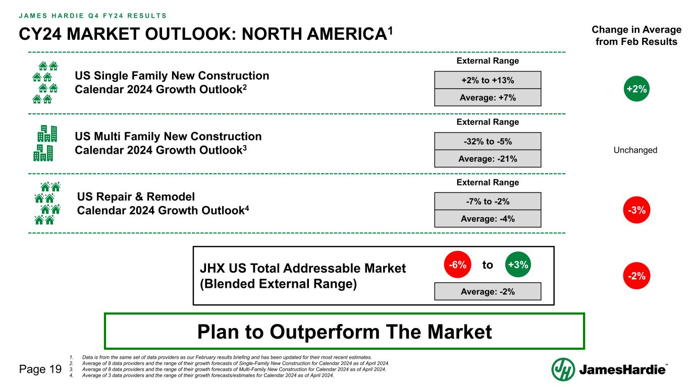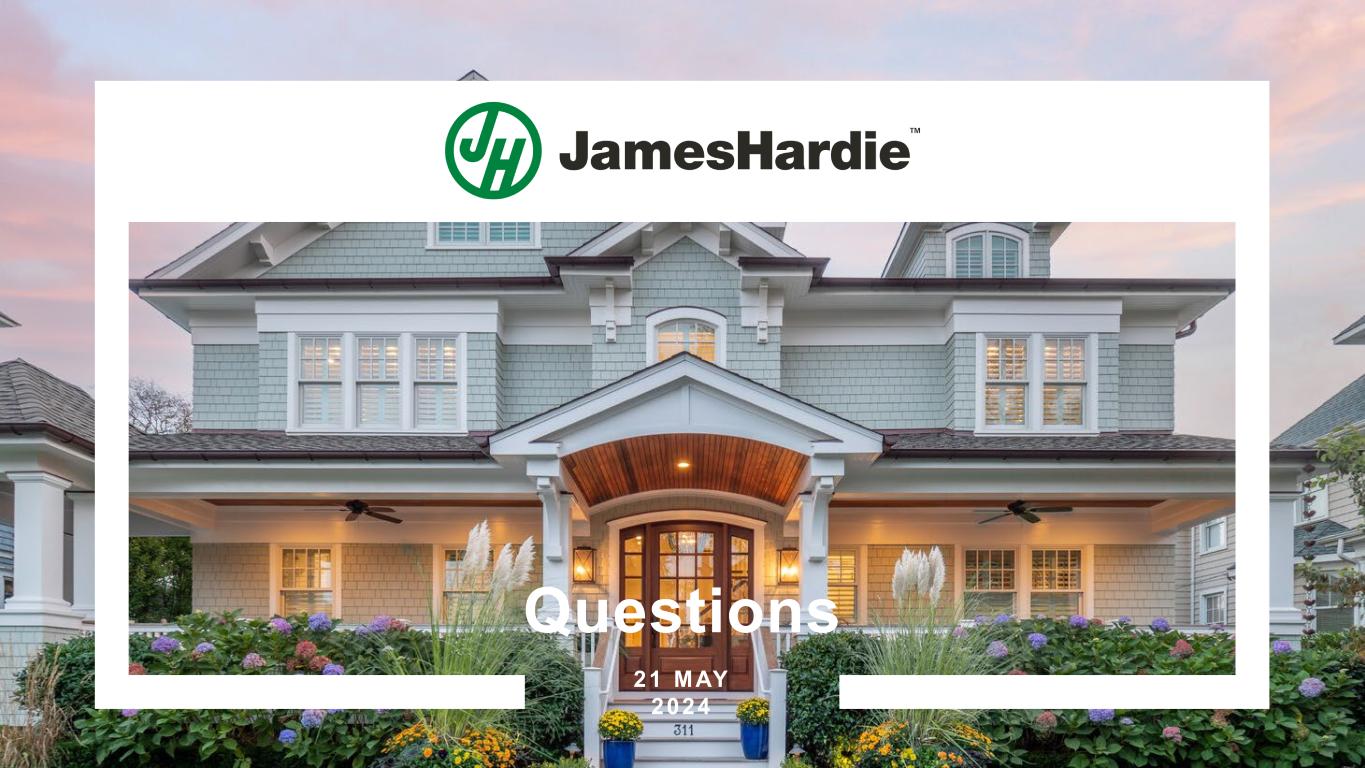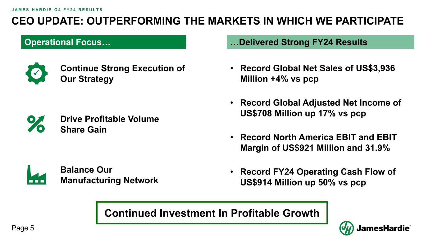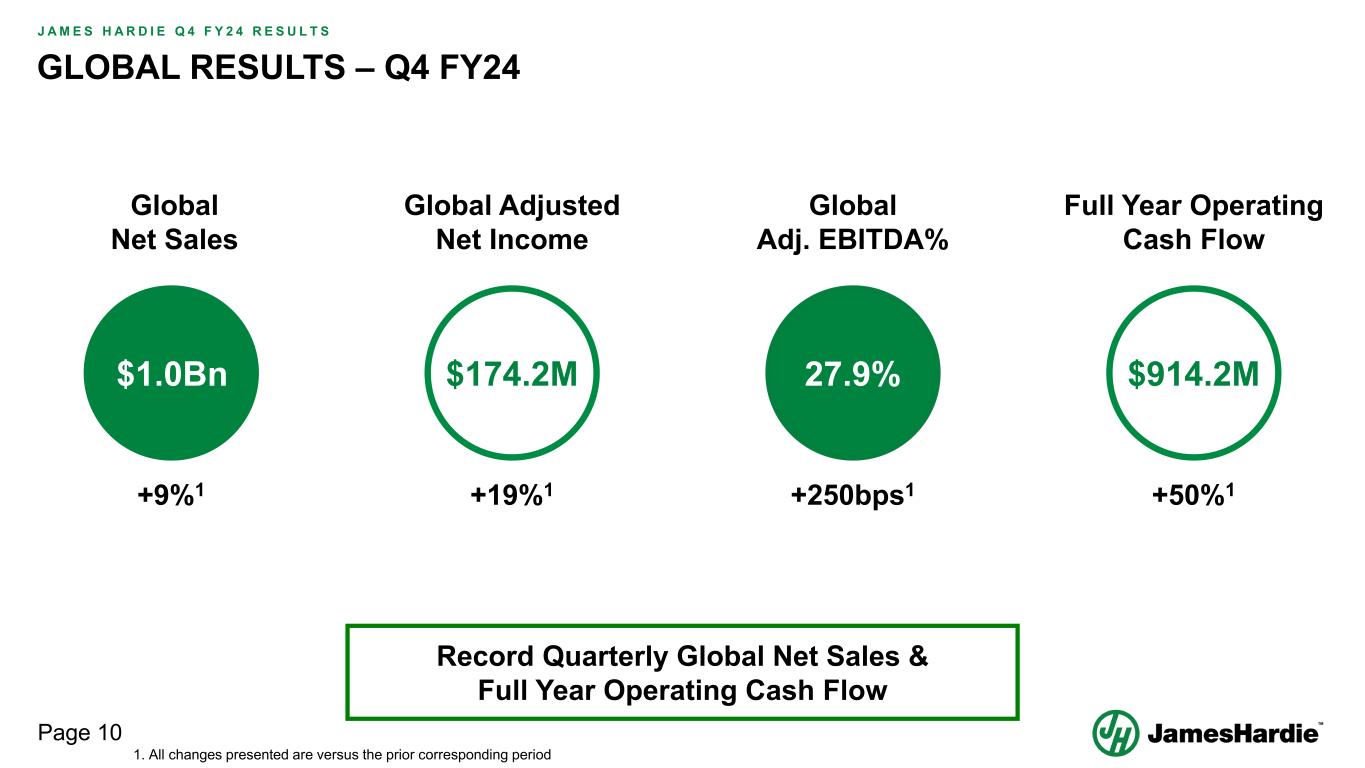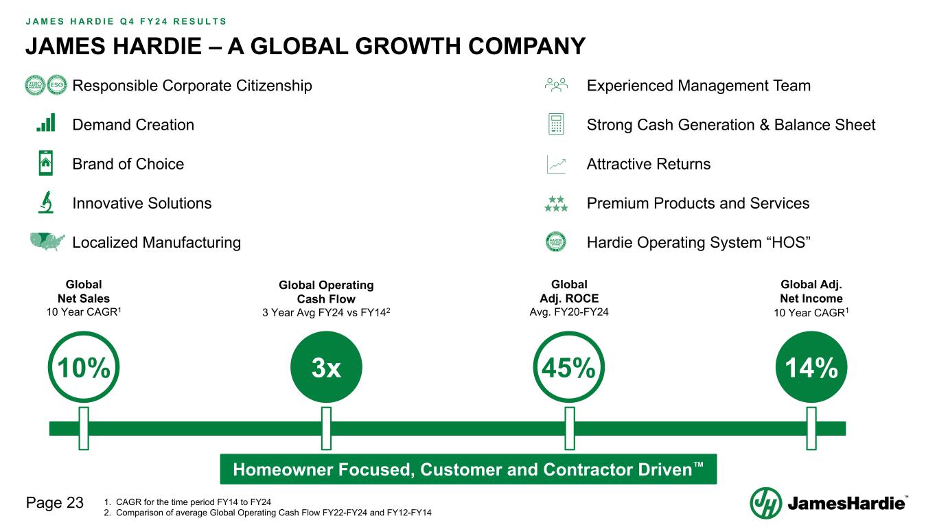Page 23 J A M E S H A R D I E Q 4 F Y 2 4 R E S U L T S JAMES HARDIE – A GLOBAL GROWTH COMPANY Responsible Corporate Citizenship Demand Creation Brand of Choice Innovative Solutions Localized Manufacturing Experienced Management Team Strong Cash Generation & Balance Sheet Attractive Returns Premium Products and Services Hardie Operating System “HOS” 1. CAGR for the time period FY14 to FY24 2. Comparison of average Global Operating Cash Flow FY22-FY24 and FY12-FY14 Homeowner Focused, Customer and Contractor Driven 10% 14%3x 45% Global Net Sales 10 Year CAGR1 Global Adj. ROCE Avg. FY20-FY24 Global Operating Cash Flow 3 Year Avg FY24 vs FY142 Global Adj. Net Income 10 Year CAGR1
