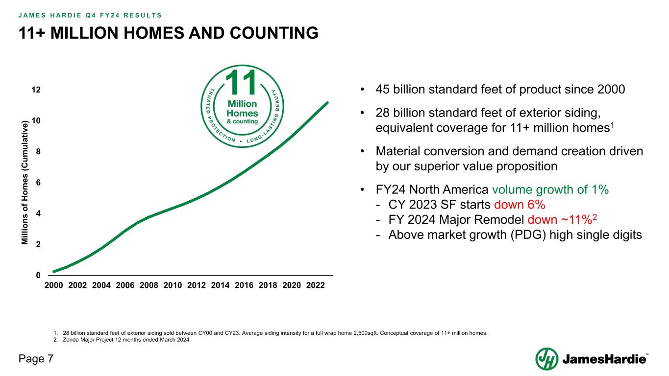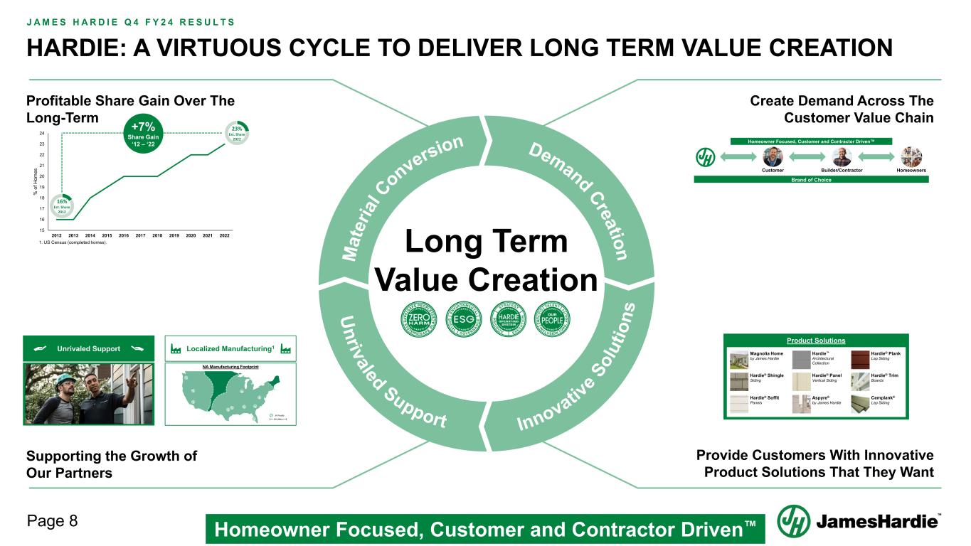 Page 7 J A M E S H A R D I E Q 4 F Y 2 4 R E S U L T S 11+ MILLION HOMES AND COUNTING • 45 billion standard feet of product since 2000 • 28 billion standard feet of exterior siding, equivalent coverage for 11+ million homes1 • Material conversion and demand creation driven by our superior value proposition • FY24 North America volume growth of 1% - CY 2023 SF starts down 6% - FY 2024 Major Remodel down ~11%2 - Above market growth (PDG) high single digits 1. 28 billion standard feet of exterior siding sold between CY00 and CY23. Average siding intensity for a full wrap home 2,500sqft. Conceptual coverage of 11+ million homes. 2. Zonda Major Project 12 months ended March 2024 0 2 4 6 8 10 12 2000 2002 2004 2006 2008 2010 2012 2014 2016 2018 2020 2022 M ill io ns o f H om es (C um ul at iv e) 11