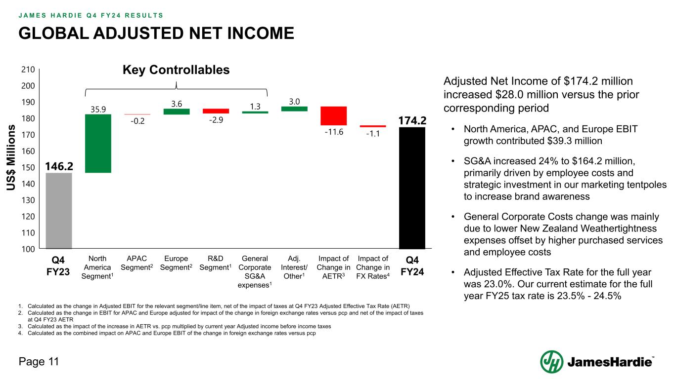 Page 10 J A M E S H A R D I E Q 4 F Y 2 4 R E S U L T S GLOBAL RESULTS – Q4 FY24 $914.2M$174.2M$1.0Bn 27.9% Global Net Sales +9%1 +19%1 Global Adjusted Net Income Global Adj. EBITDA% +250bps1 Full Year Operating Cash Flow +50%1 Record Quarterly Global Net Sales & Full Year Operating Cash Flow 1. All changes presented are versus the prior corresponding period