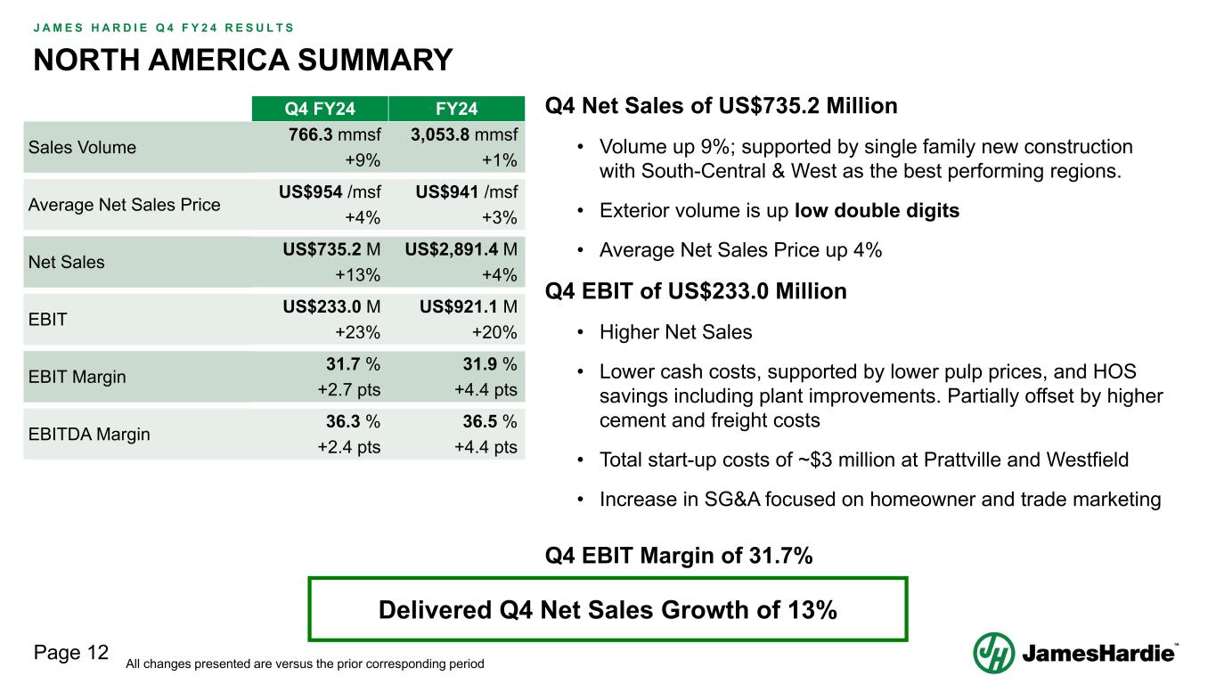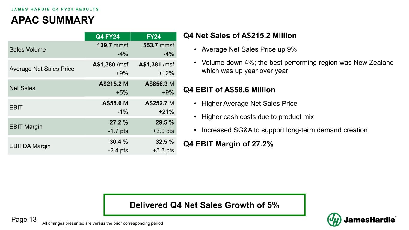Page 12 J A M E S H A R D I E Q 4 F Y 2 4 R E S U L T S NORTH AMERICA SUMMARY Q4 Net Sales of US$735.2 Million • Volume up 9%; supported by single family new construction with South-Central & West as the best performing regions. • Exterior volume is up low double digits • Average Net Sales Price up 4% Q4 EBIT of US$233.0 Million • Higher Net Sales • Lower cash costs, supported by lower pulp prices, and HOS savings including plant improvements. Partially offset by higher cement and freight costs • Total start-up costs of ~$3 million at Prattville and Westfield • Increase in SG&A focused on homeowner and trade marketing Q4 EBIT Margin of 31.7% Delivered Q4 Net Sales Growth of 13% Q4 FY24 FY24 Sales Volume 766.3 mmsf 3,053.8 mmsf +9% +1% Average Net Sales Price US$954 /msf US$941 /msf +4% +3% Net Sales US$735.2 M US$2,891.4 M +13% +4% EBIT US$233.0 M US$921.1 M +23% +20% EBIT Margin 31.7 % 31.9 % +2.7 pts +4.4 pts EBITDA Margin 36.3 % 36.5 % +2.4 pts +4.4 pts All changes presented are versus the prior corresponding period