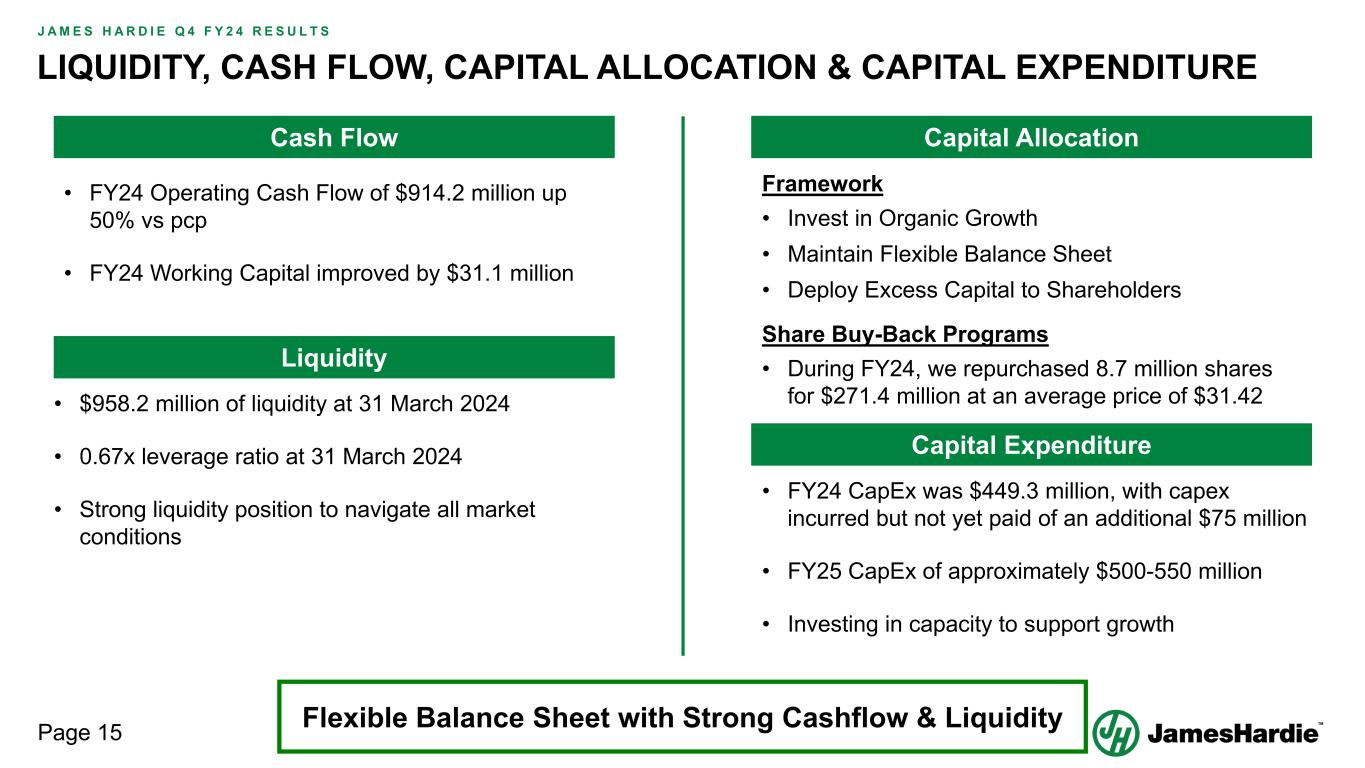 Page 15 J A M E S H A R D I E Q 4 F Y 2 4 R E S U L T S LIQUIDITY, CASH FLOW, CAPITAL ALLOCATION & CAPITAL EXPENDITURE • FY24 Operating Cash Flow of $914.2 million up 50% vs pcp • FY24 Working Capital improved by $31.1 million • $958.2 million of liquidity at 31 March 2024 • 0.67x leverage ratio at 31 March 2024 • Strong liquidity position to navigate all market conditions Cash Flow Liquidity Capital Allocation Framework • Invest in Organic Growth • Maintain Flexible Balance Sheet • Deploy Excess Capital to Shareholders Share Buy-Back Programs • During FY24, we repurchased 8.7 million shares for $271.4 million at an average price of $31.42 • FY24 CapEx was $449.3 million, with capex incurred but not yet paid of an additional $75 million • FY25 CapEx of approximately $500-550 million • Investing in capacity to support growth Capital Expenditure Flexible Balance Sheet with Strong Cashflow & Liquidity