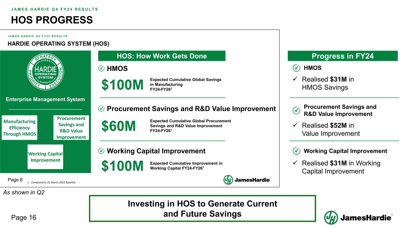 Page 16 J A M E S H A R D I E Q 4 F Y 2 4 R E S U L T S HOS PROGRESS Investing in HOS to Generate Current and Future Savings Page 8 J A M E S H A R D I E Q 2 F Y 2 4 R E S U L T S HARDIE OPERATING SYSTEM (HOS) Manufacturing Efficiency Through HMOS Working Capital Improvement Procurement Savings and R&D Value Improvement HOS: How Work Gets Done Procurement Savings and R&D Value Improvement Expected Cumulative Global Savings in Manufacturing FY24-FY261 $60M Expected Cumulative Global Procurement Savings and R&D Value Improvement FY24-FY261 HMOS Working Capital Improvement $100M Expected Cumulative Improvement in Working Capital FY24-FY261 $100M Enterprise Management System 1. Compared to 31 March 2023 Baseline Realised $31M in HMOS Savings Progress in FY24 As shown in Q2 Procurement Savings and R&D Value Improvement HMOS Realised $52M in Value Improvement Working Capital Improvement Realised $31M in Working Capital Improvement