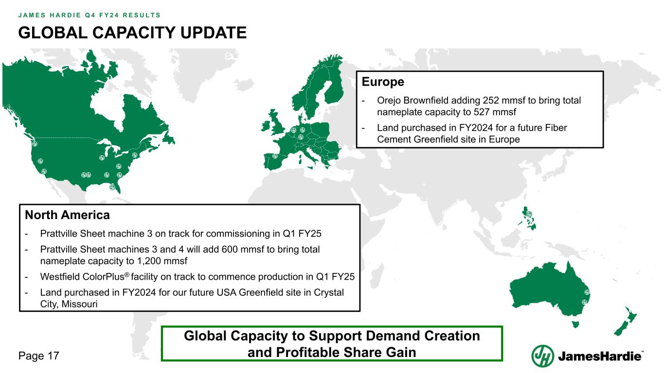 Page 17 J A M E S H A R D I E Q 4 F Y 2 4 R E S U L T S GLOBAL CAPACITY UPDATE North America - Prattville Sheet machine 3 on track for commissioning in Q1 FY25 - Prattville Sheet machines 3 and 4 will add 600 mmsf to bring total nameplate capacity to 1,200 mmsf - Westfield ColorPlus® facility on track to commence production in Q1 FY25 - Land purchased in FY2024 for our future USA Greenfield site in Crystal City, Missouri Global Capacity to Support Demand Creation and Profitable Share Gain Europe - Orejo Brownfield adding 252 mmsf to bring total nameplate capacity to 527 mmsf - Land purchased in FY2024 for a future Fiber Cement Greenfield site in Europe