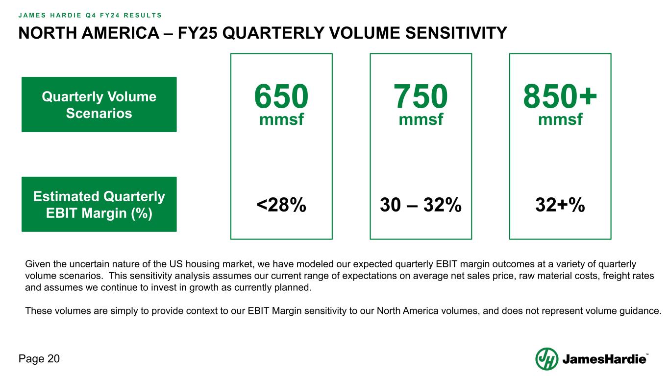 Page 19 J A M E S H A R D I E Q 4 F Y 2 4 R E S U L T S CY24 MARKET OUTLOOK: NORTH AMERICA1 1. Data is from the same set of data providers as our February results briefing and has been updated for their most recent estimates. 2. Average of 8 data providers and the range of their growth forecasts of Single-Family New Construction for Calendar 2024 as of April 2024. 3. Average of 8 data providers and the range of their growth forecasts of Multi-Family New Construction for Calendar 2024 as of April 2024. 4. Average of 3 data providers and the range of their growth forecasts/estimates for Calendar 2024 as of April 2024. US Single Family New Construction Calendar 2024 Growth Outlook2 US Repair & Remodel Calendar 2024 Growth Outlook4 External Range +2% to +13% Average: +7% External Range -32% to -5% Average: -21% US Multi Family New Construction Calendar 2024 Growth Outlook3 External Range -7% to -2% Average: -4% -6% +3%toJHX US Total Addressable Market (Blended External Range) Plan to Outperform The Market Average: -2% -3% -2% +2% Unchanged Change in Average from Feb Results