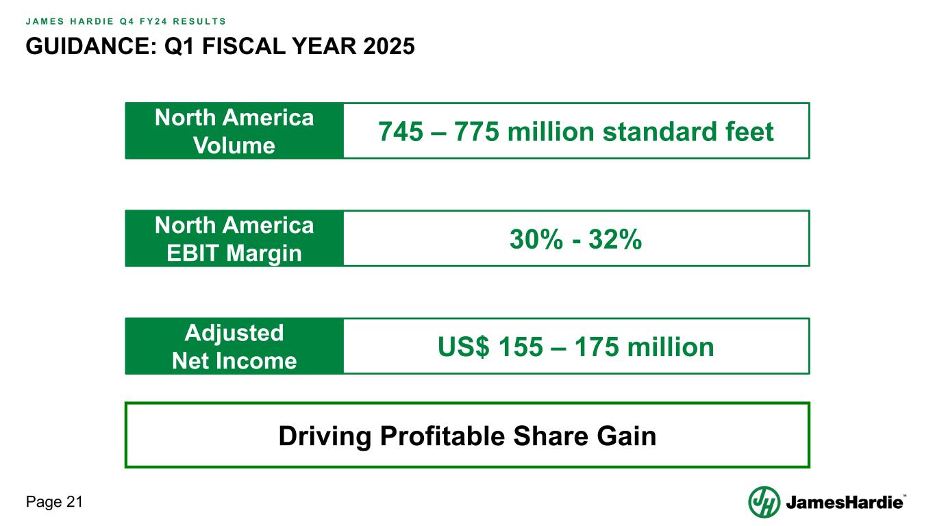 Page 20 J A M E S H A R D I E Q 4 F Y 2 4 R E S U L T S NORTH AMERICA – FY25 QUARTERLY VOLUME SENSITIVITY Estimated Quarterly EBIT Margin (%) 30 – 32% 750 mmsf <28% 650 mmsf Quarterly Volume Scenarios Given the uncertain nature of the US housing market, we have modeled our expected quarterly EBIT margin outcomes at a variety of quarterly volume scenarios. This sensitivity analysis assumes our current range of expectations on average net sales price, raw material costs, freight rates and assumes we continue to invest in growth as currently planned. These volumes are simply to provide context to our EBIT Margin sensitivity to our North America volumes, and does not represent volume guidance. 32+% 850+ mmsf