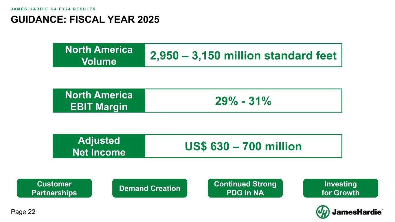 Page 21 J A M E S H A R D I E Q 4 F Y 2 4 R E S U L T S GUIDANCE: Q1 FISCAL YEAR 2025 Driving Profitable Share Gain Adjusted Net Income US$ 155 – 175 million North America Volume 745 – 775 million standard feet North America EBIT Margin 30% - 32%
