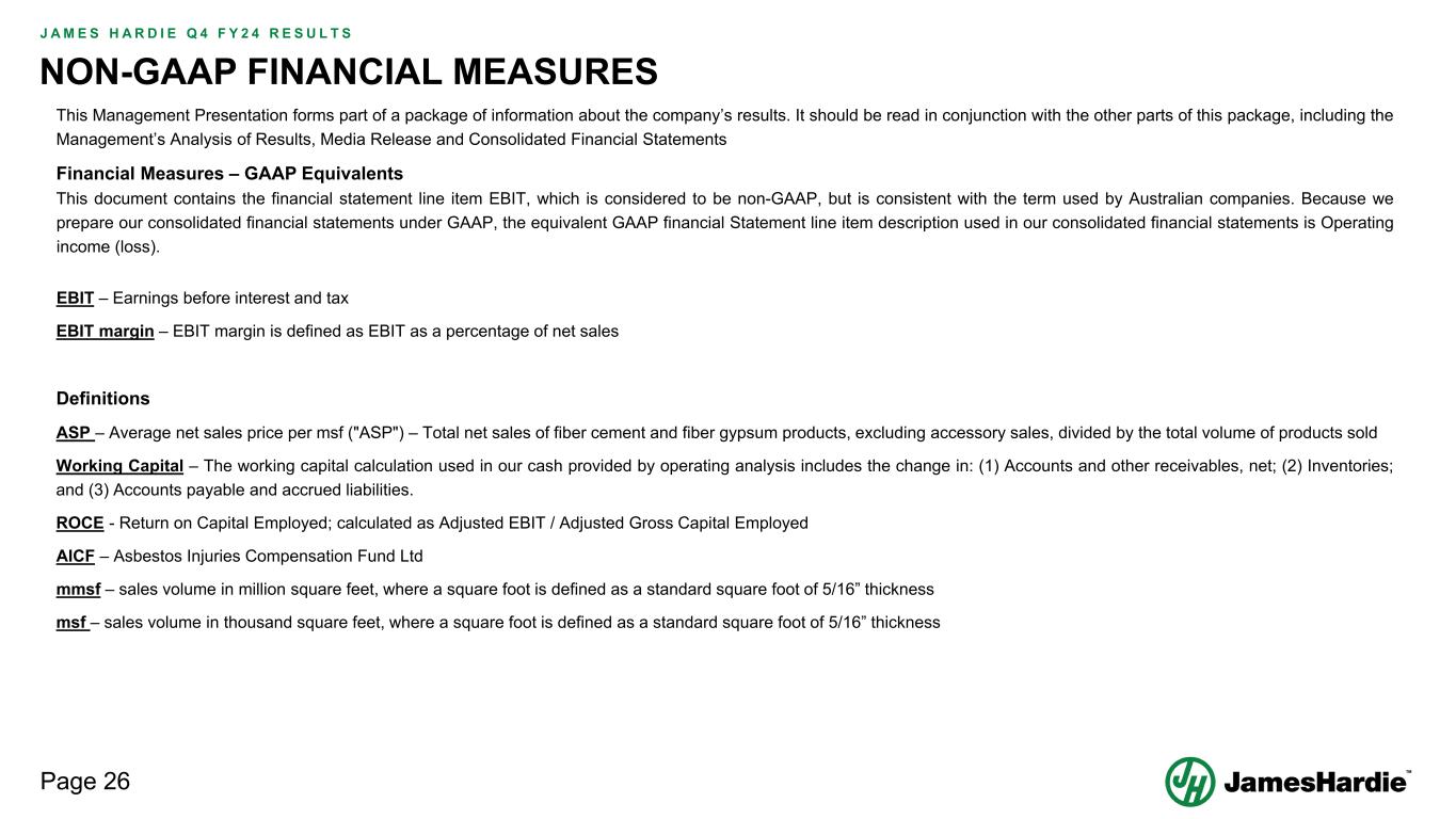Page 26 J A M E S H A R D I E Q 4 F Y 2 4 R E S U L T S NON-GAAP FINANCIAL MEASURES This Management Presentation forms part of a package of information about the company’s results. It should be read in conjunction with the other parts of this package, including the Management’s Analysis of Results, Media Release and Consolidated Financial Statements Financial Measures – GAAP Equivalents This document contains the financial statement line item EBIT, which is considered to be non-GAAP, but is consistent with the term used by Australian companies. Because we prepare our consolidated financial statements under GAAP, the equivalent GAAP financial Statement line item description used in our consolidated financial statements is Operating income (loss). EBIT – Earnings before interest and tax EBIT margin – EBIT margin is defined as EBIT as a percentage of net sales Definitions ASP – Average net sales price per msf ("ASP") – Total net sales of fiber cement and fiber gypsum products, excluding accessory sales, divided by the total volume of products sold Working Capital – The working capital calculation used in our cash provided by operating analysis includes the change in: (1) Accounts and other receivables, net; (2) Inventories; and (3) Accounts payable and accrued liabilities. ROCE - Return on Capital Employed; calculated as Adjusted EBIT / Adjusted Gross Capital Employed AICF – Asbestos Injuries Compensation Fund Ltd mmsf – sales volume in million square feet, where a square foot is defined as a standard square foot of 5/16” thickness msf – sales volume in thousand square feet, where a square foot is defined as a standard square foot of 5/16” thickness