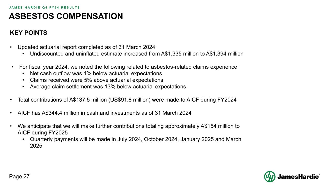 Page 27 J A M E S H A R D I E Q 4 F Y 2 4 R E S U L T S 1 KEY POINTS • Updated actuarial report completed as of 31 March 2024 • Undiscounted and uninflated estimate increased from A$1,335 million to A$1,394 million • For fiscal year 2024, we noted the following related to asbestos-related claims experience: • Net cash outflow was 1% below actuarial expectations • Claims received were 5% above actuarial expectations • Average claim settlement was 13% below actuarial expectations • Total contributions of A$137.5 million (US$91.8 million) were made to AICF during FY2024 • AICF has A$344.4 million in cash and investments as of 31 March 2024 • We anticipate that we will make further contributions totaling approximately A$154 million to AICF during FY2025 • Quarterly payments will be made in July 2024, October 2024, January 2025 and March 2025 ASBESTOS COMPENSATION
