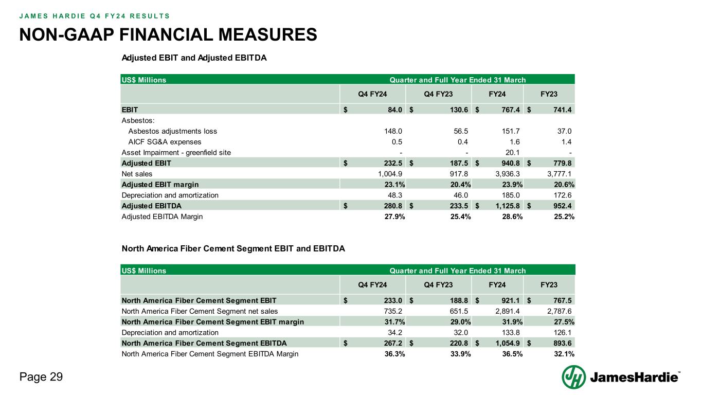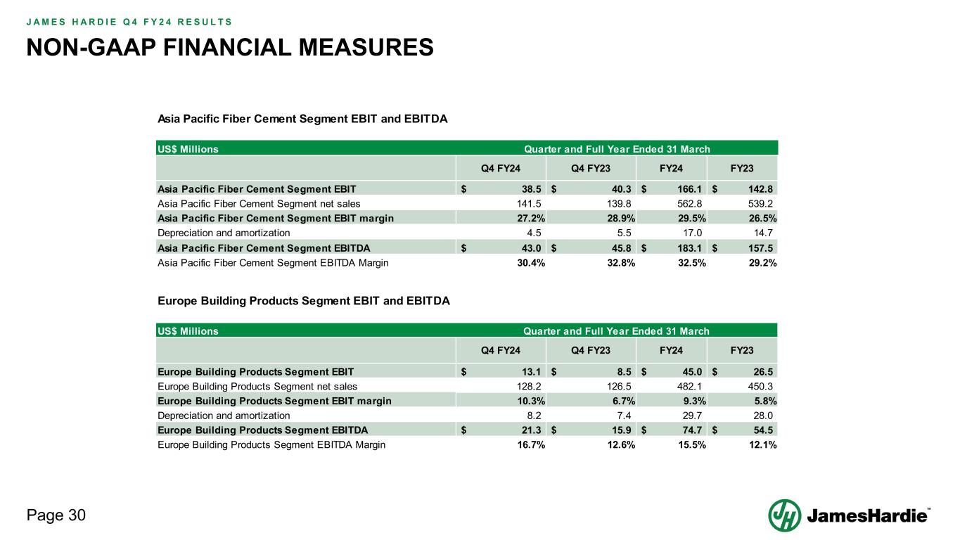 Page 30 J A M E S H A R D I E Q 4 F Y 2 4 R E S U L T S NON-GAAP FINANCIAL MEASURES US$ Millions Q4 FY24 Q4 FY23 FY24 FY23 Asia Pacific Fiber Cement Segment EBIT 38.5$ 40.3$ 166.1$ 142.8$ Asia Pacific Fiber Cement Segment net sales 141.5 139.8 562.8 539.2 Asia Pacific Fiber Cement Segment EBIT margin 27.2% 28.9% 29.5% 26.5% Depreciation and amortization 4.5 5.5 17.0 14.7 Asia Pacific Fiber Cement Segment EBITDA 43.0$ 45.8$ 183.1$ 157.5$ Asia Pacific Fiber Cement Segment EBITDA Margin 30.4% 32.8% 32.5% 29.2% Asia Pacific Fiber Cement Segment EBIT and EBITDA Quarter and Full Year Ended 31 March US$ Millions Q4 FY24 Q4 FY23 FY24 FY23 Europe Building Products Segment EBIT 13.1$ 8.5$ 45.0$ 26.5$ Europe Building Products Segment net sales 128.2 126.5 482.1 450.3 Europe Building Products Segment EBIT margin 10.3% 6.7% 9.3% 5.8% Depreciation and amortization 8.2 7.4 29.7 28.0 Europe Building Products Segment EBITDA 21.3$ 15.9$ 74.7$ 54.5$ Europe Building Products Segment EBITDA Margin 16.7% 12.6% 15.5% 12.1% Quarter and Full Year Ended 31 March Europe Building Products Segment EBIT and EBITDA
