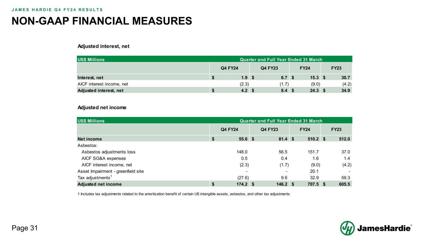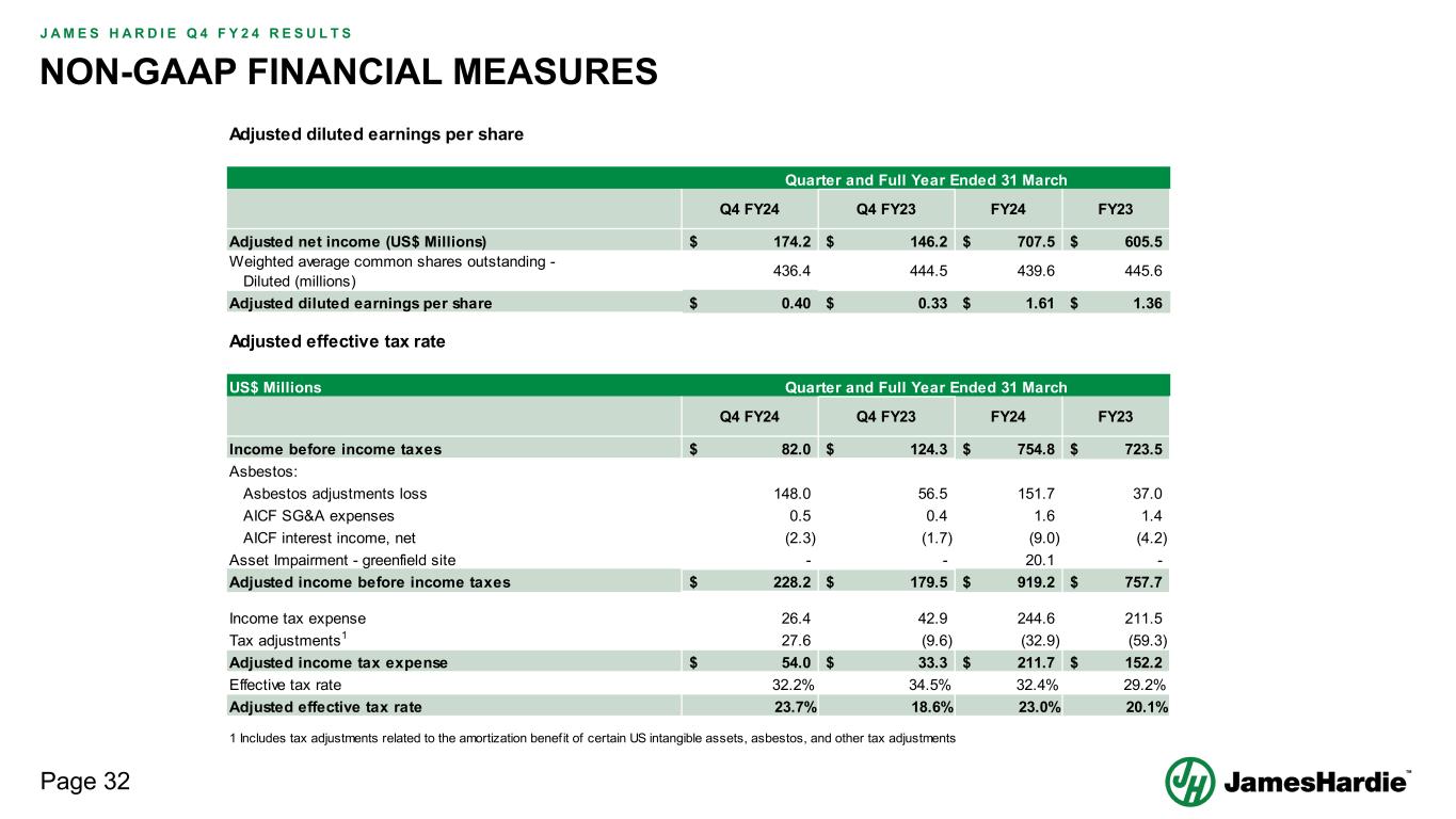 Page 31 J A M E S H A R D I E Q 4 F Y 2 4 R E S U L T S NON-GAAP FINANCIAL MEASURES US$ Millions Q4 FY24 Q4 FY23 FY24 FY23 Interest, net 1.9$ 6.7$ 15.3$ 30.7$ AICF interest income, net (2.3) (1.7) (9.0) (4.2) Adjusted interest, net 4.2$ 8.4$ 24.3$ 34.9$ Adjusted interest, net Quarter and Full Year Ended 31 March Adjusted net income US$ Millions Q4 FY24 Q4 FY23 FY24 FY23 Net income 55.6$ 81.4$ 510.2$ 512.0$ Asbestos: Asbestos adjustments loss 148.0 56.5 151.7 37.0 AICF SG&A expenses 0.5 0.4 1.6 1.4 AICF interest income, net (2.3) (1.7) (9.0) (4.2) Asset Impairment - greenfield site - - 20.1 - Tax adjustments1 (27.6) 9.6 32.9 59.3 Adjusted net income 174.2$ 146.2$ 707.5$ 605.5$ 1 Includes tax adjustments related to the amortization benefit of certain US intangible assets, asbestos, and other tax adjustments Quarter and Full Year Ended 31 March
