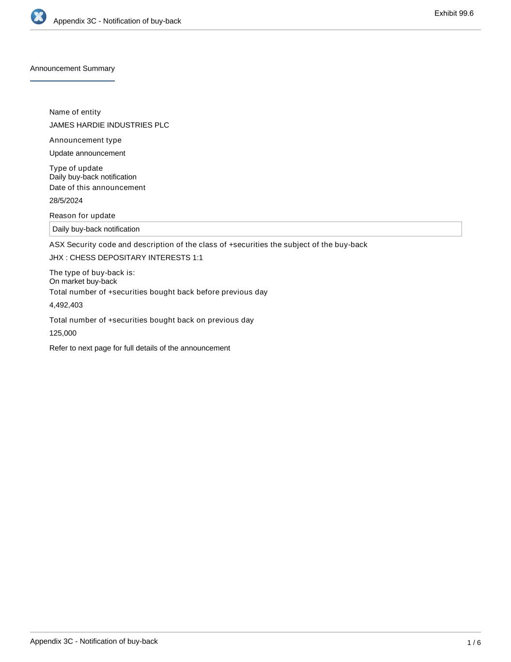 Appendix 3C - Notification of buy-back Appendix 3C - Notification of buy-back 1 / 6 Announcement Summary Name of entity JAMES HARDIE INDUSTRIES PLC Announcement type Update announcement Type of update Date of this announcement 28/5/2024 Reason for update Daily buy-back notification ASX Security code and description of the class of +securities the subject of the buy-back JHX : CHESS DEPOSITARY INTERESTS 1:1 The type of buy-back is: Total number of +securities bought back before previous day 4,492,403 Total number of +securities bought back on previous day 125,000 Refer to next page for full details of the announcement On market buy-back Daily buy-back notification Exhibit 99.6